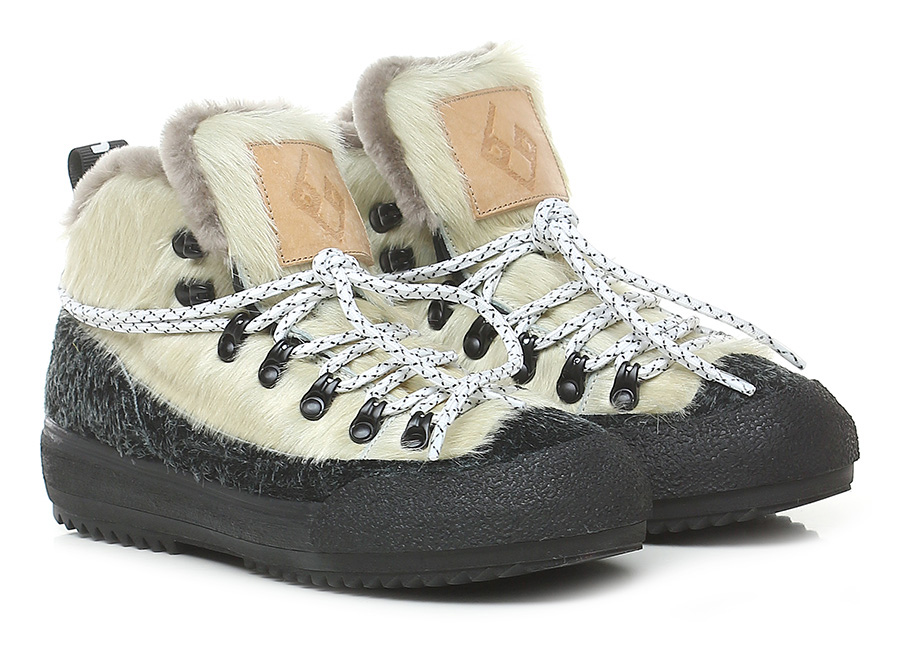 Sneaker in real fur con suola in gomma. La suola presenta il sistema antiscivolo OC SYSTEM TIPPER con staffa mobile che permette di camminare su qualsiasi superficie anche ricoperta da ghiaccio. Altezza tacco 40mm, platform 30mm con battuta 10mm.