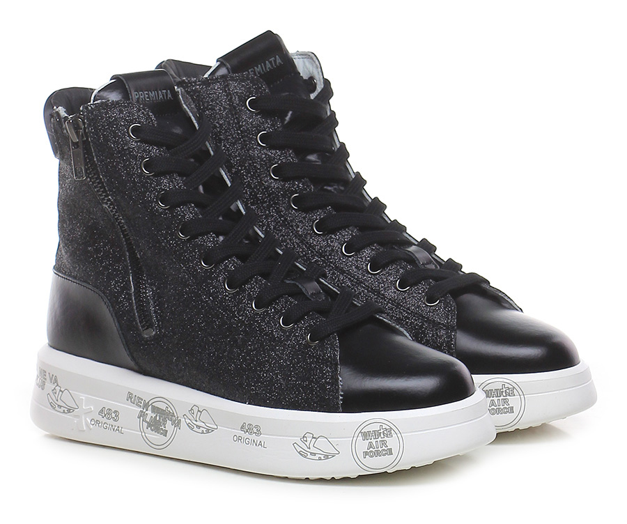Sneaker in glitter, pelle e tessuto con zip lato esterno, suola in gomma. Altezza suola: 40. platform 35 con battuta 5.