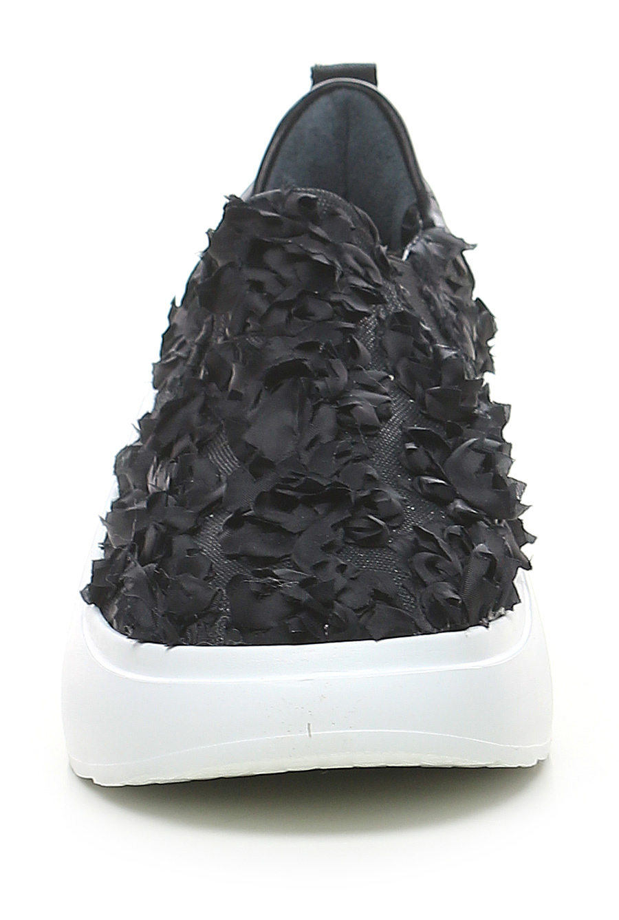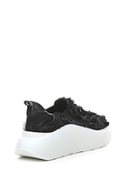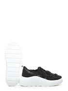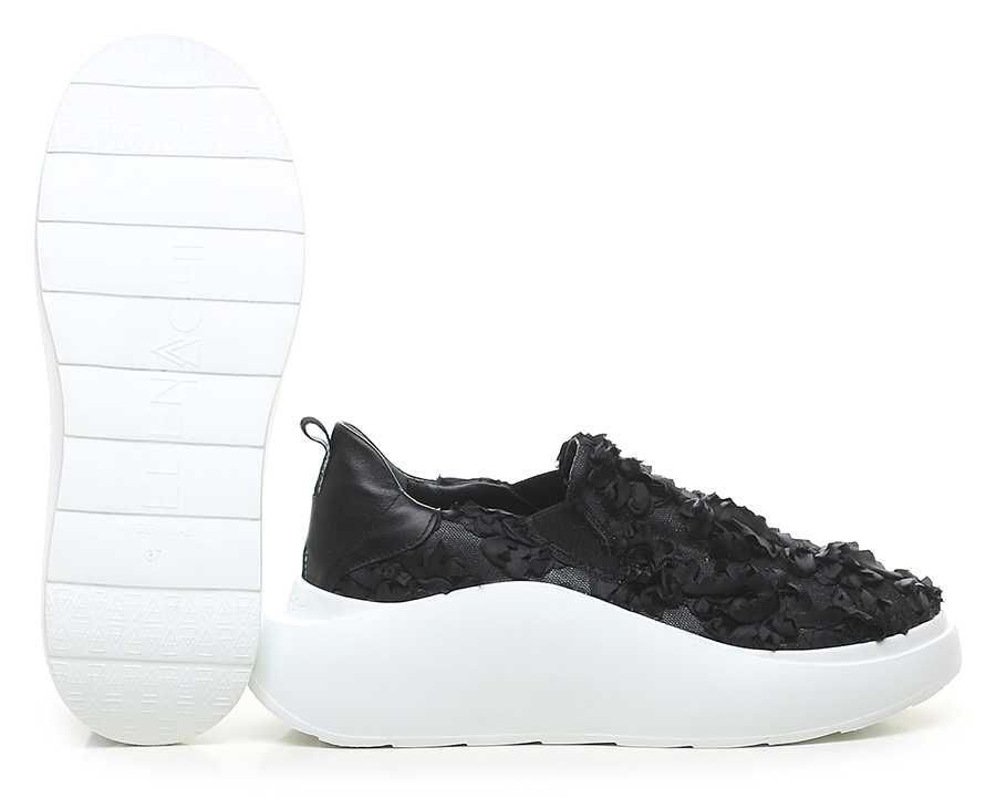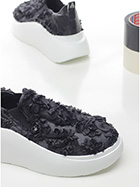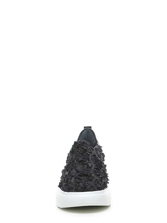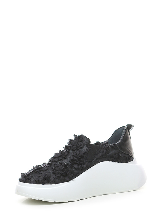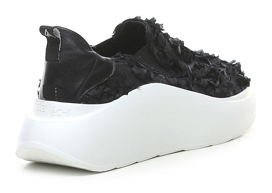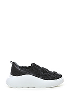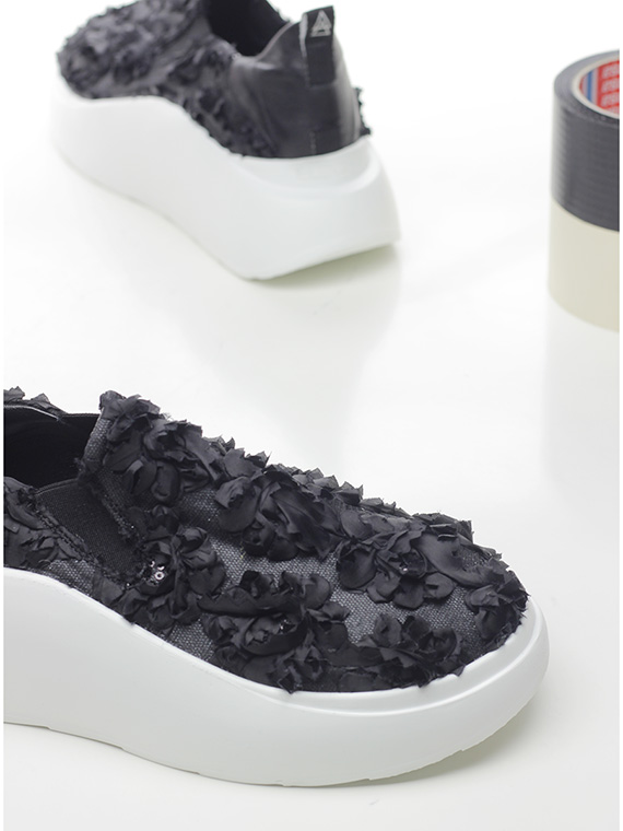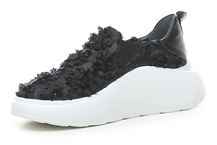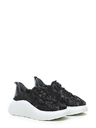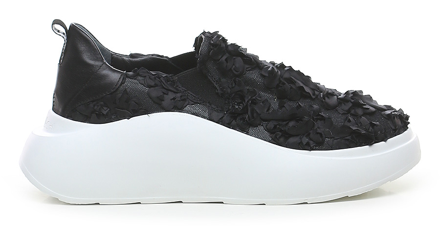 Sneaker in tessuto con inserti elasticizzati ambo i lati con talloncino in pelle. Suola in gomma. Altezza tacco 55mm, platform 40mm con battuta 15mm.