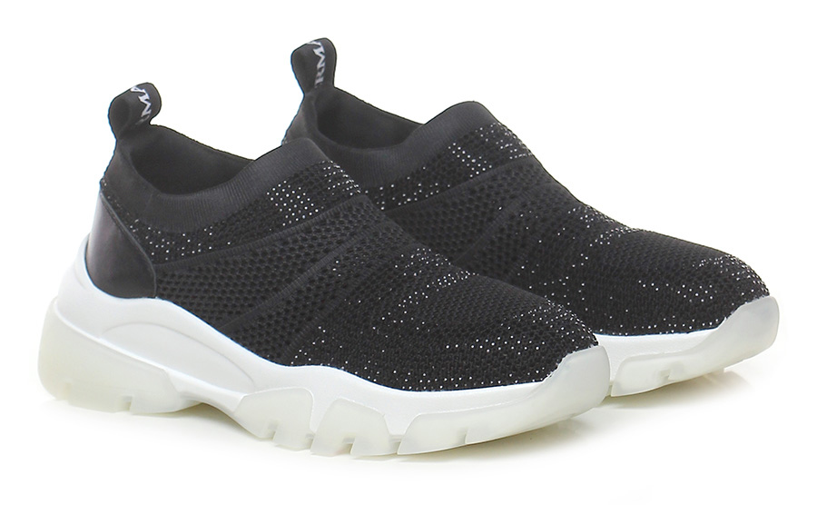Sneaker in tessuto stretch a maglia con inserti in pelle e strass su tomaia, suola in gomma. Altezza suola: 50, platform 35 con battuta 15.