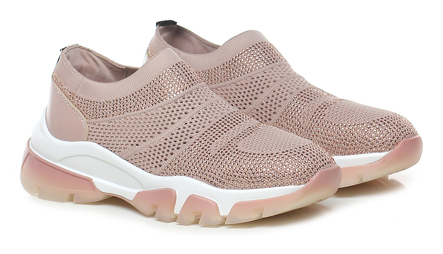 Sneaker in tessuto stretch a maglia con inserti in pelle e strass su tomaia, suola in gomma. Altezza suola: 50, platform 35 con battuta 15.