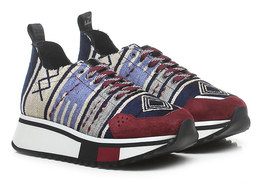 Sneaker in tessuto e camoscio con suola in gomma. Altezza tacco 45mm, platform 35mm con battuta 10mm.