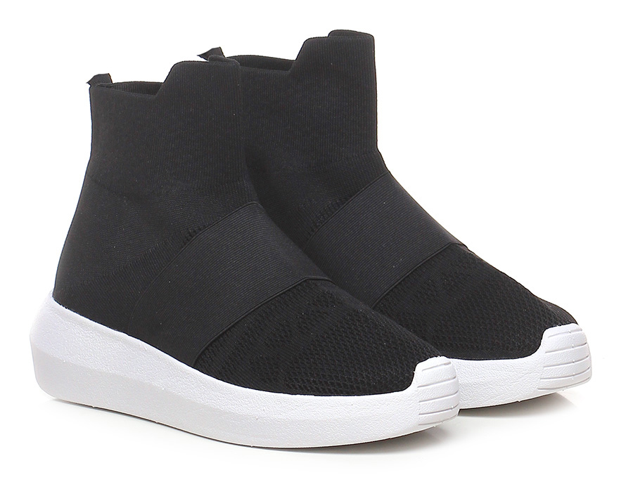 Sneaker in tessuto stretch con fascia elasticizzata frontale, suola in gomma extra light. Tacco 55, platform 30 con battuta 25. Soletta interna effetto sughero