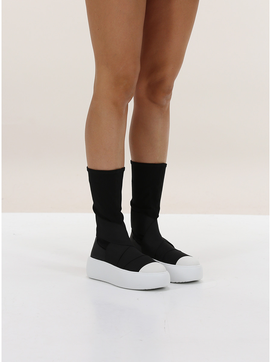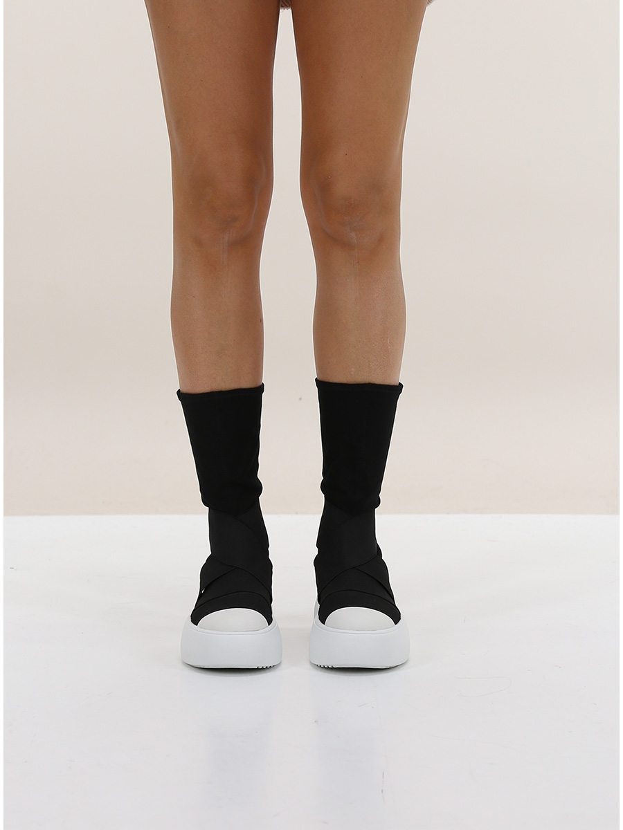 Sneaker in tessuto elasticizzato e gomma con suola in gomma. Altezza tacco 50mm, platform 45mm con battuta 5mm.