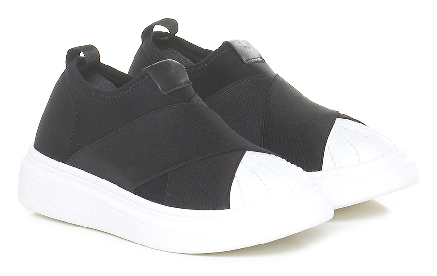 Sneaker in eco pelle con tessuto elasticizzato e doppia fascia elasticizzata ad incrocio frontale. Suola in gomma, tacco 45, platform 30 con battuta 15.