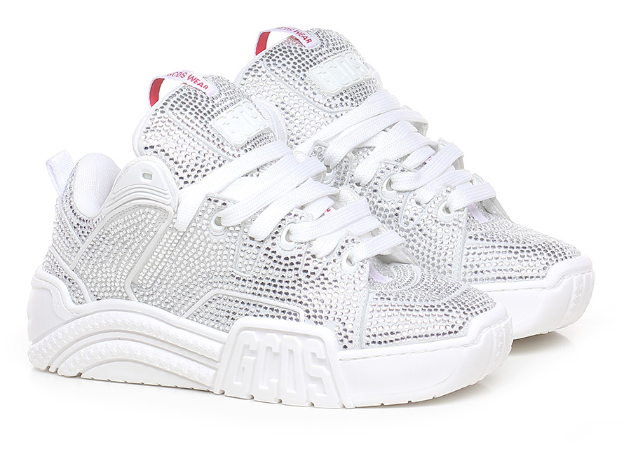 Sneaker in pelle e tessuto tempestata di swarovski, suola in gomma. Altezza suola 45, platform 30 con battuta 15.