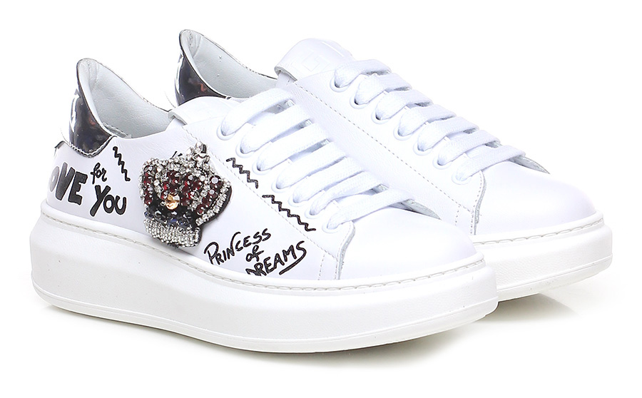 Sneaker in pelle con graffiti in tomaia e accessorio in strass in lato esterno, suola in gomma. Tacco 40, platform 30 con battuta 10.