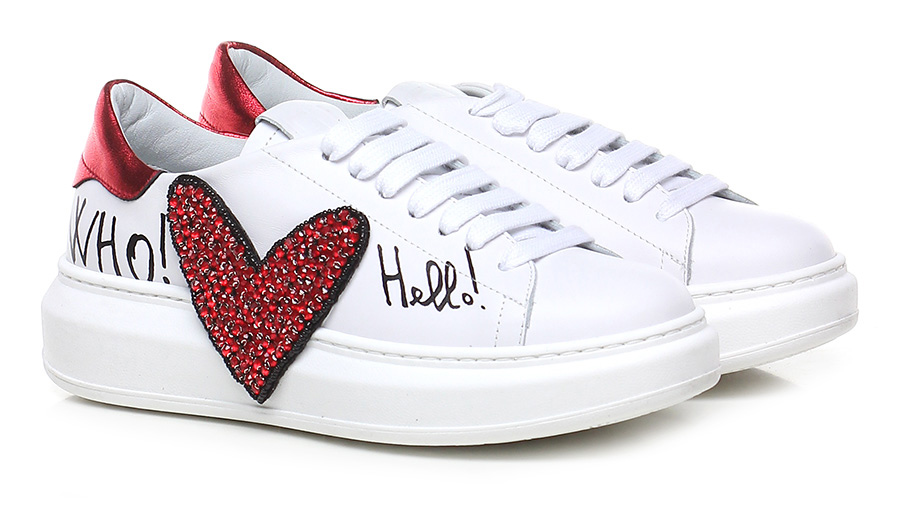 Sneaker in pelle e talloncino in pelle laminata con accessorio in strass lato esterno, suola in gomma. Altezza suola: 40, platform 30 con battuta 10. Graffiti su tomaia.