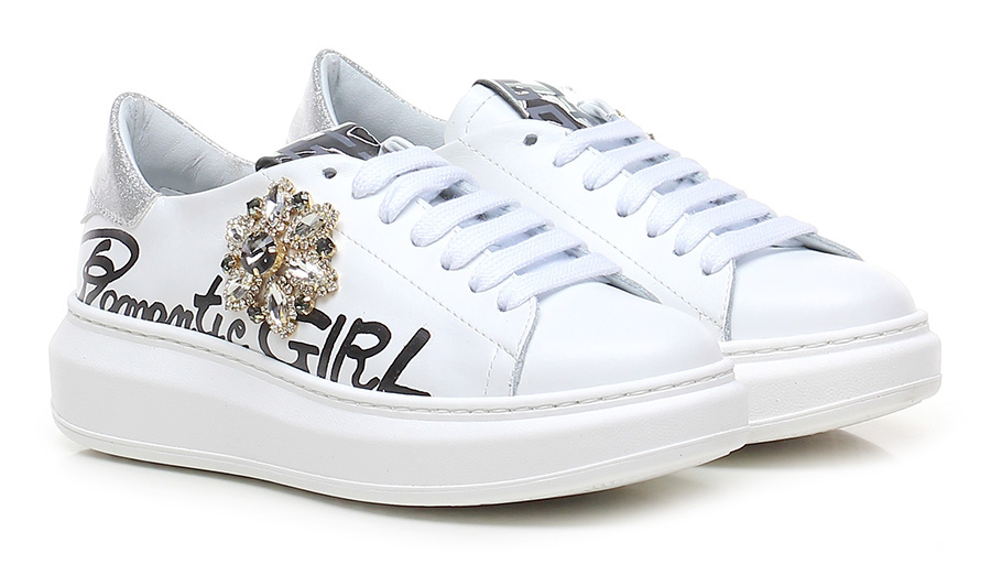 Sneaker in pelle con graffiti in tomaia e accessorio in strass in lato esterno, suola in gomma. Altezza suola: 55, platform 35 con battuta 20.