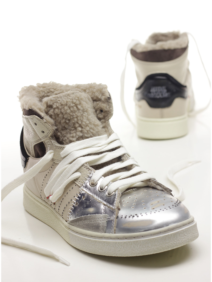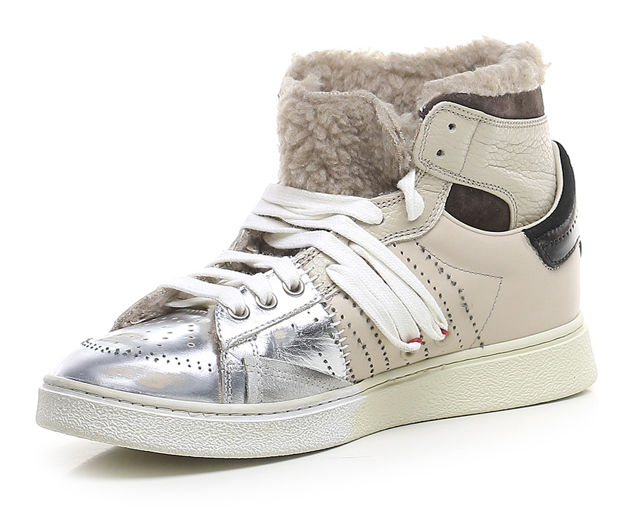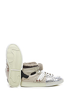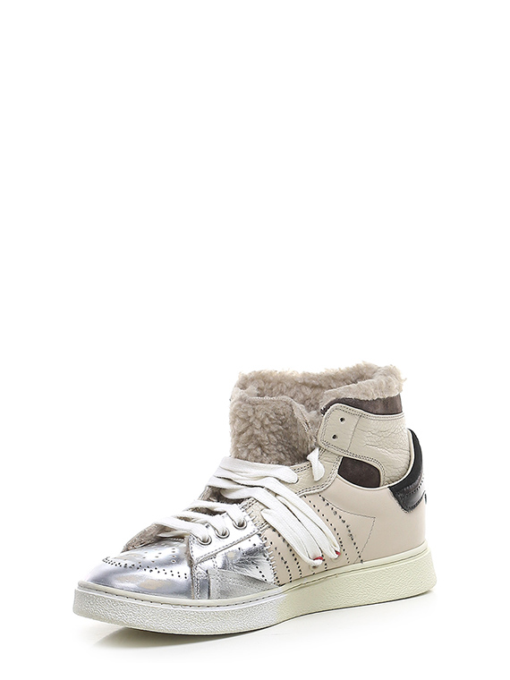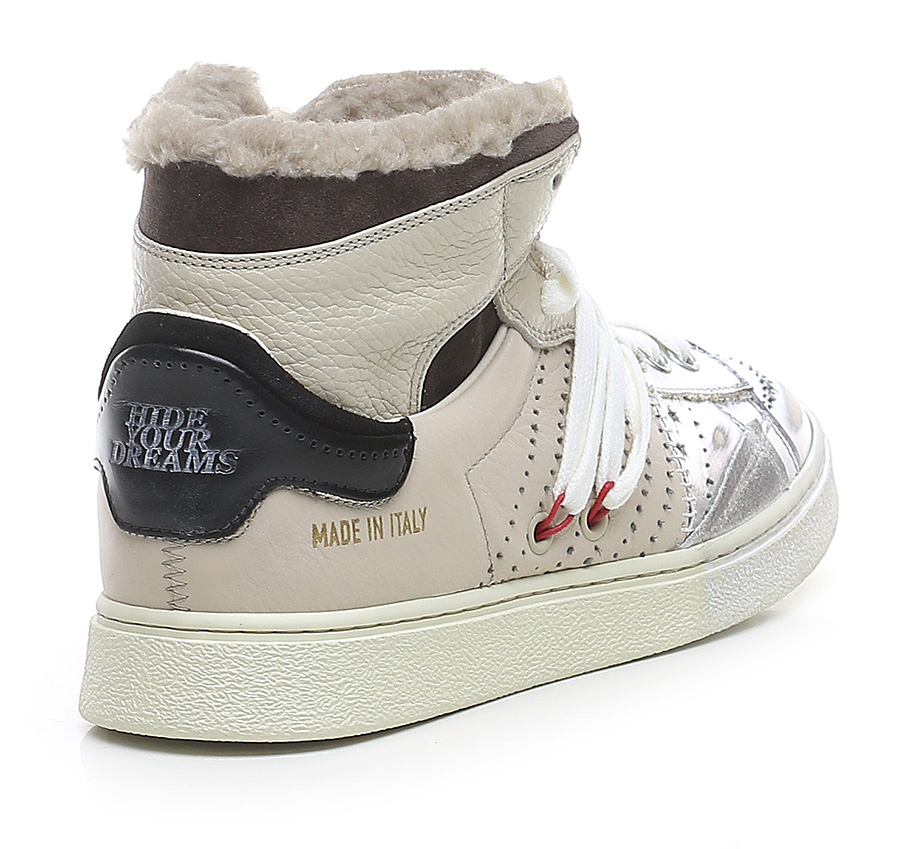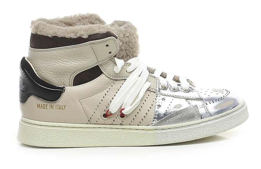 Sneaker in pelle e pelle laminata effetto vintage con inserti in camoscio effetto vintage, foderata in lana. Suola in gomma. Altezza tacco 25mm, platform 20mm con battuta 5mm