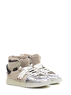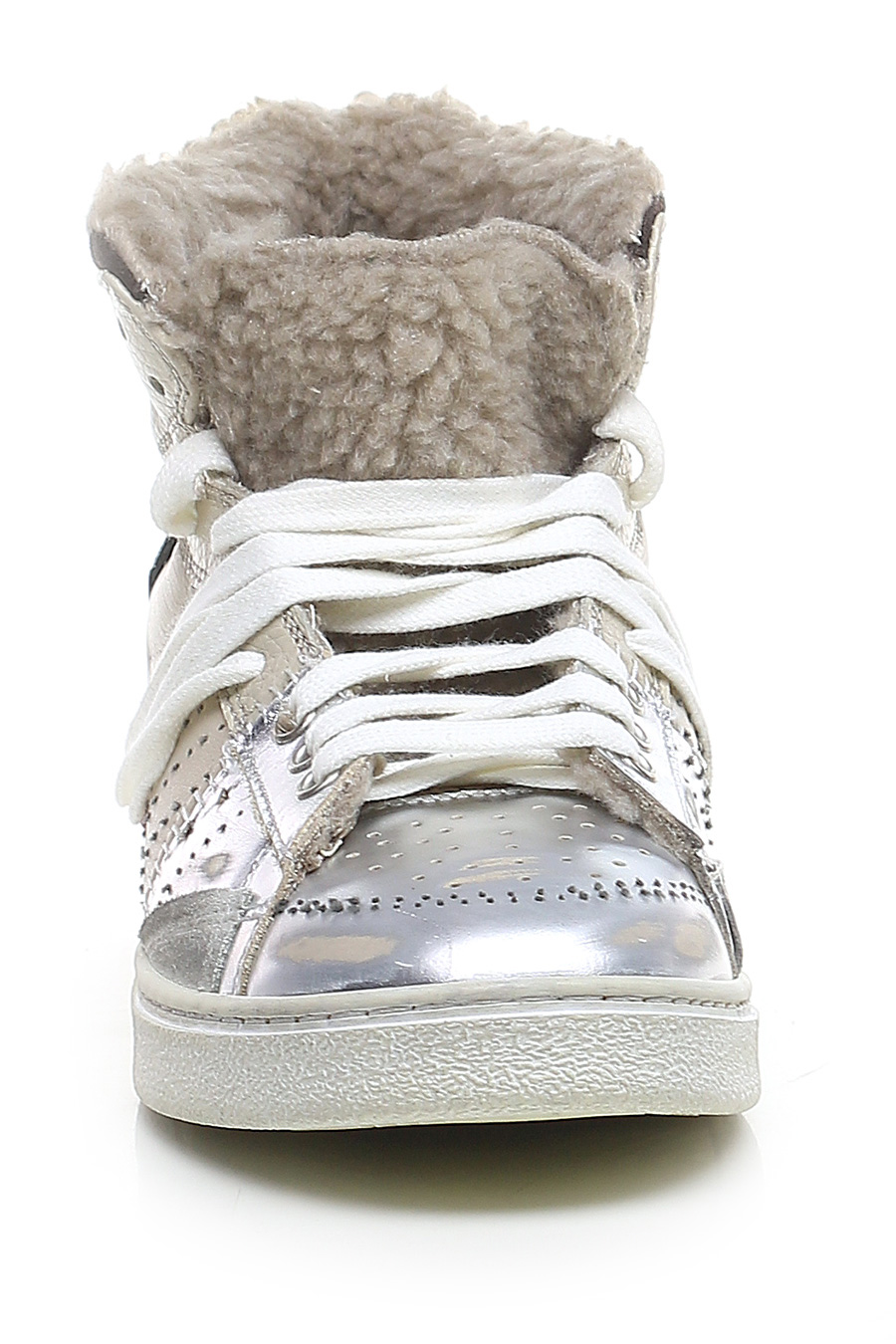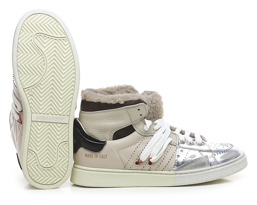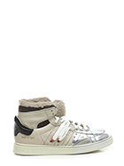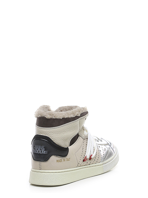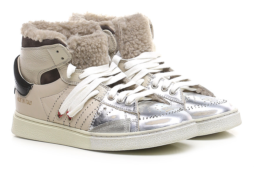 Sneaker in pelle e pelle laminata effetto vintage con inserti in camoscio effetto vintage, foderata in lana. Suola in gomma. Altezza tacco 25mm, platform 20mm con battuta 5mm