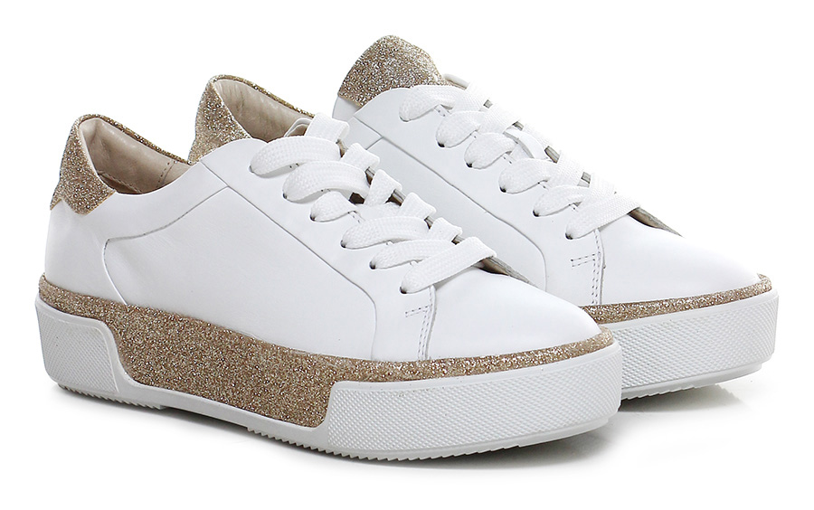 Sneaker in pelle e glitter con suola in gomma, tacco 45, platform 35 con battuta 10. Glitter su suola.