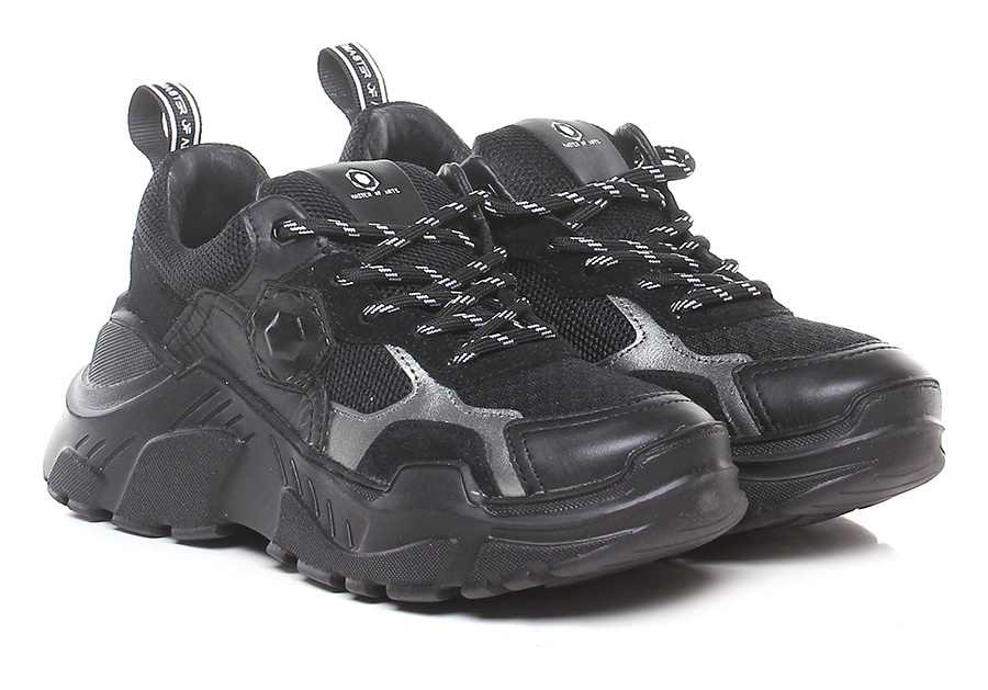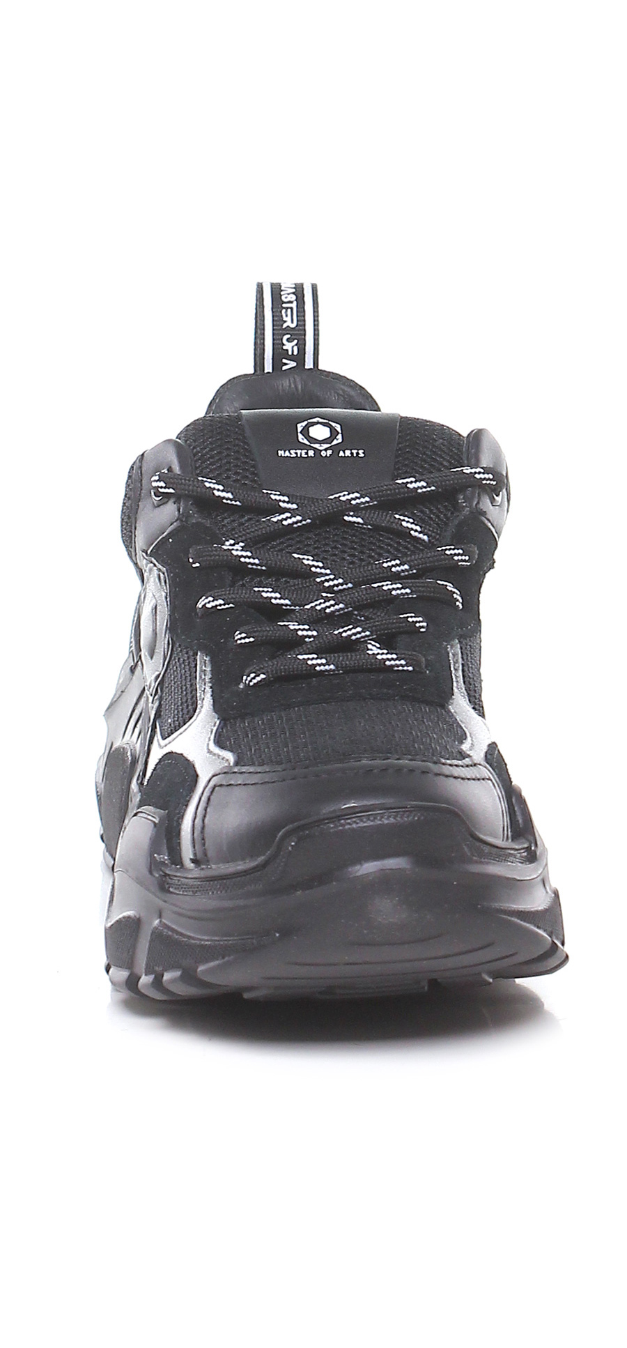 Sneaker in pelle, camoscio, pelle laminata e tessuto con suola in gomma. Tacco 60, platform 35 con battuta 25.