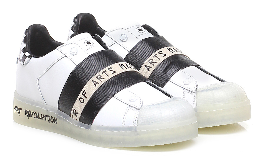 Sneaker in pelle con fascia elastica frontale e logo lettering laterale, elastico sotto linguetta. Suola in gomma. Tacco 30, platform 20 con battuta 10.