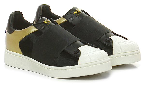 Sneaker in pelle laminata, pelle e cavallino con fascia elasticizzata frontale e suola in gomma. Tacco 40, platform 25 con battuta 15.