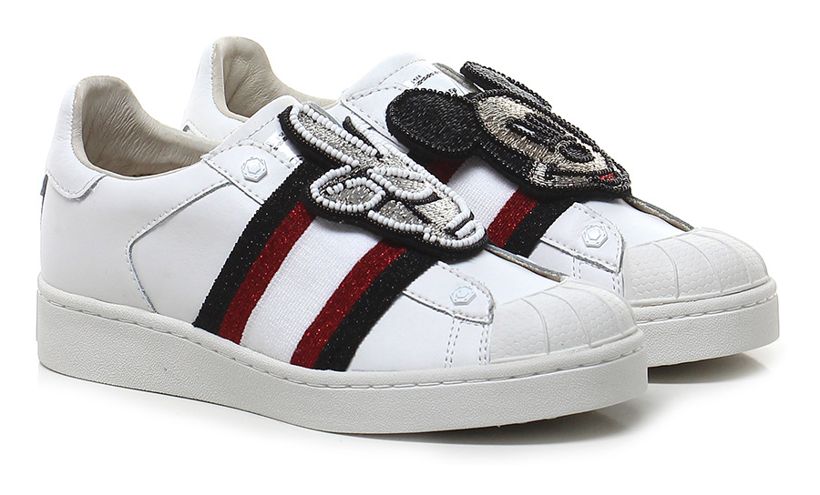 Sneaker in pelle con fascia elasticizzata interna e fascia in tessuto stretch con applicazioni lavorate frontali. Suola in gomma, tacco 30, platform 20 con battuta 10.
