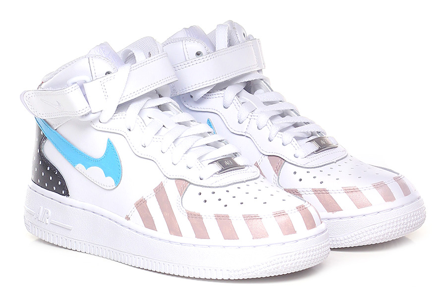 Sneaker in pelle con disegni e dipinti e chiusura a strappo alla caviglia, suola in gomma. Tacco 35, platform 25 con battuta 10.