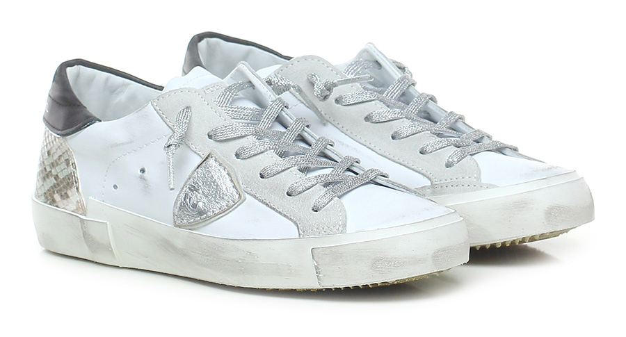 Sneaker in pelle e camoscio effetto vintage tallone in pelle stampa pitone. Suola in gomma con effetto vintage. Altezza suola 30, platform 20 con battuta 10.