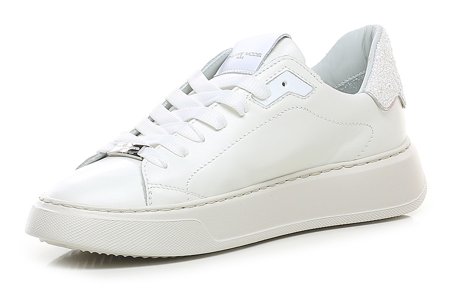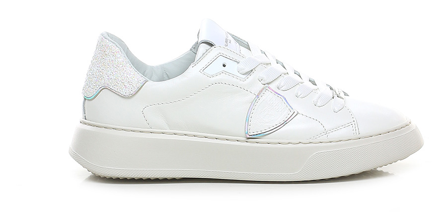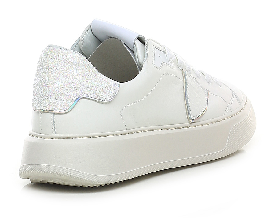 Sneaker in pelle con talloncino in glitter. Suola in gomma. Altezza tacco 35 mm, platform 25mm, battuta 10mm.