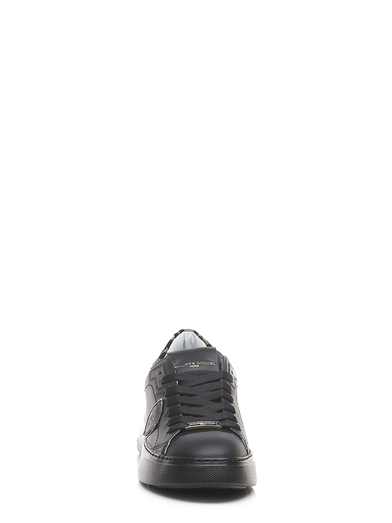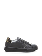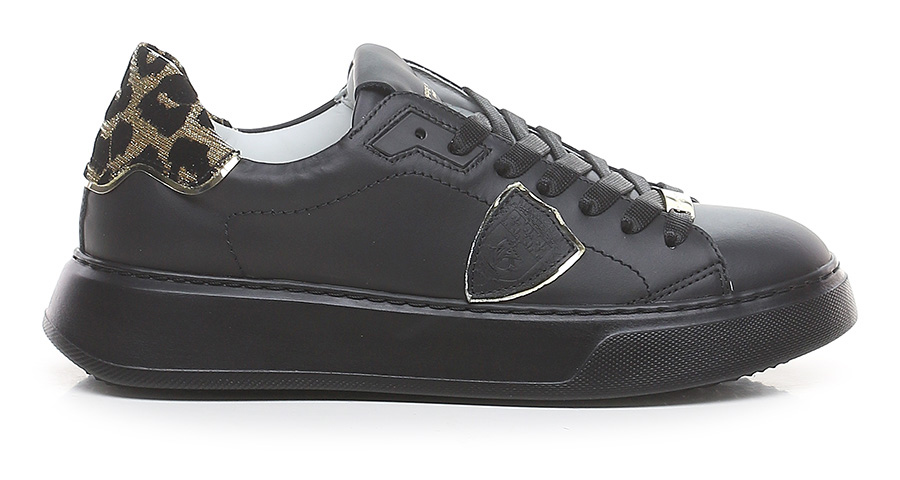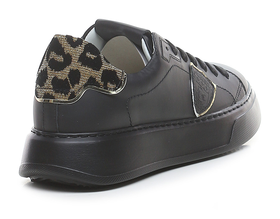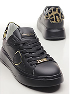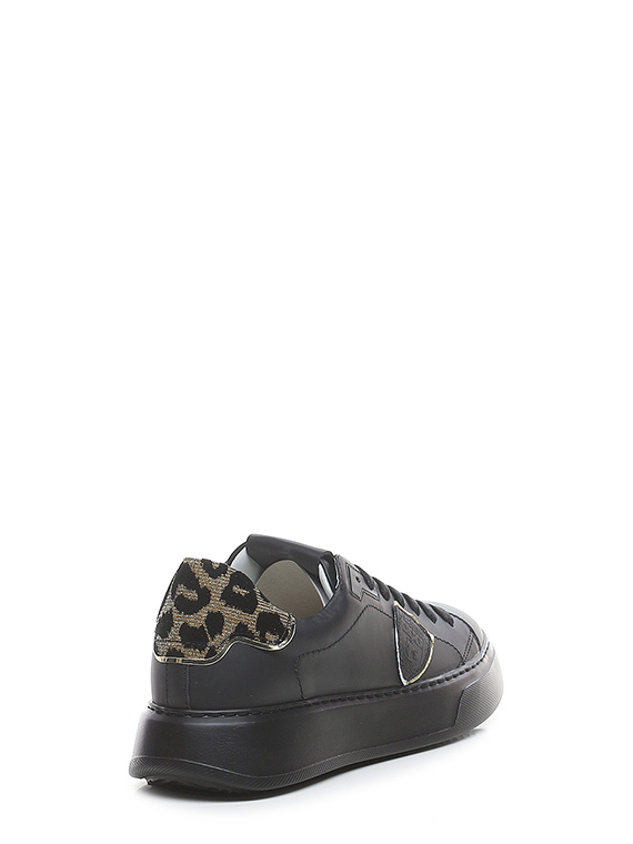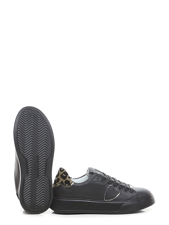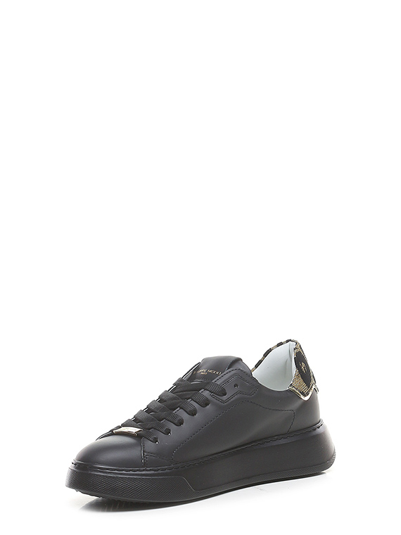 Sneaker in pelle con talloncino in tessuto effetto maculato. Altezza tacco 35mm, platform 25mm con battuta di 10mm.