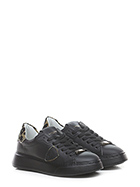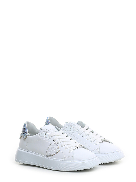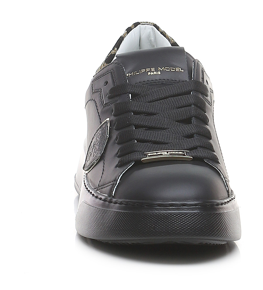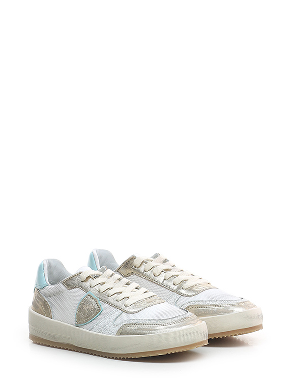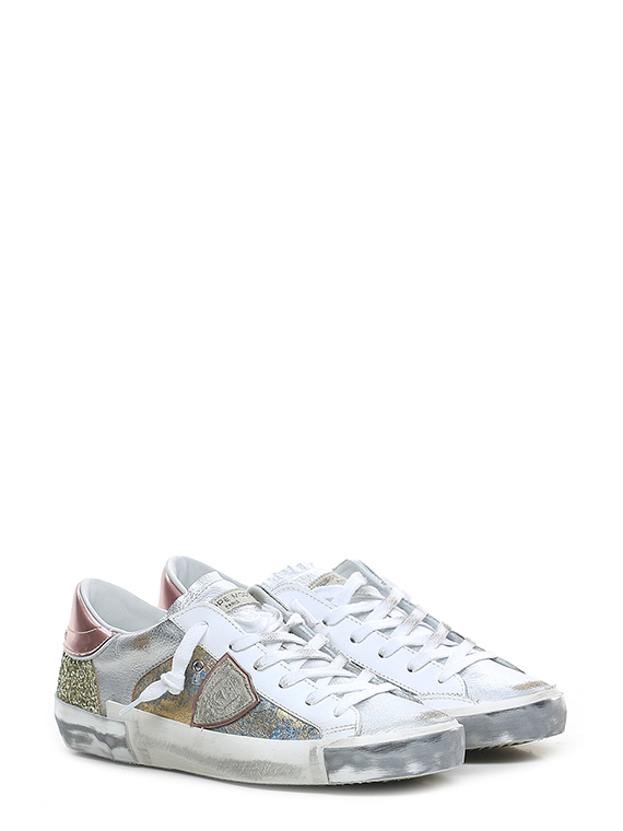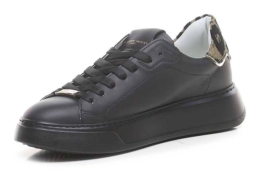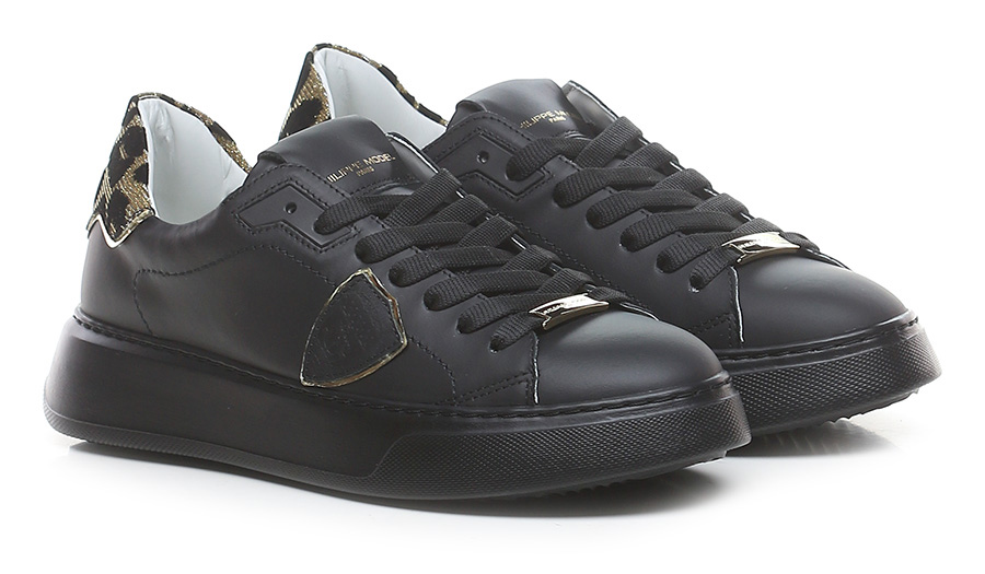 Sneaker in pelle con talloncino in tessuto effetto maculato. Altezza tacco 35mm, platform 25mm con battuta di 10mm.