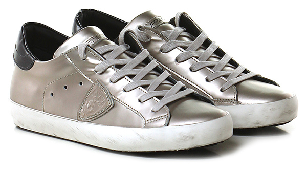 Sneaker in pelle laminata con suola in gomma vintage, tacco 45, platform 25 con battuta 20. Zeppa interna.