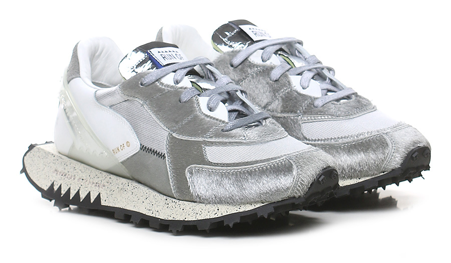 Sneaker in tessuto e cavallino con inserti in pvc, camoscio e pelle effetto vintage. Suola in gomma oversize. Altezza tacco 30mm, platform 20mm con battuta 10mm.