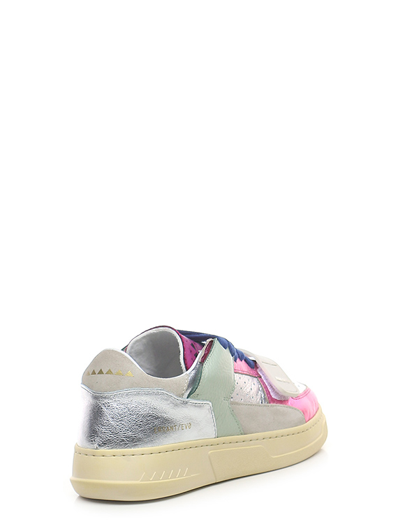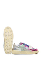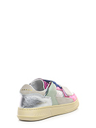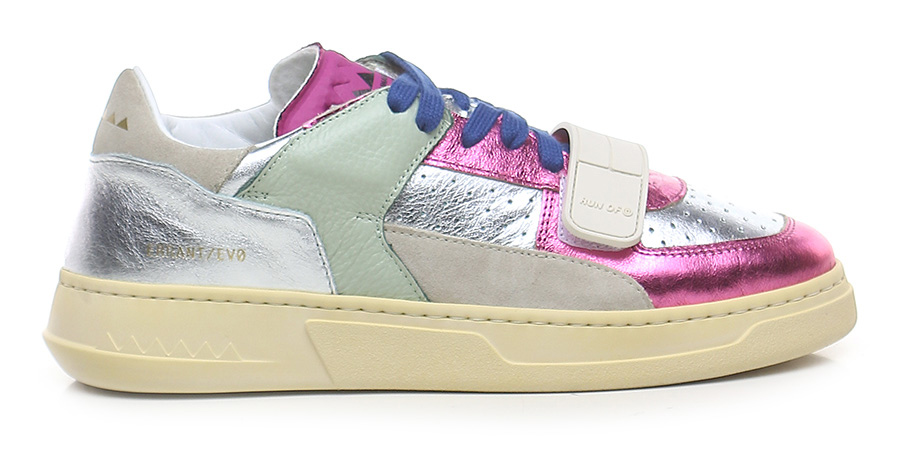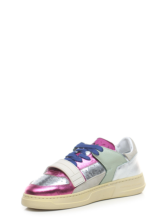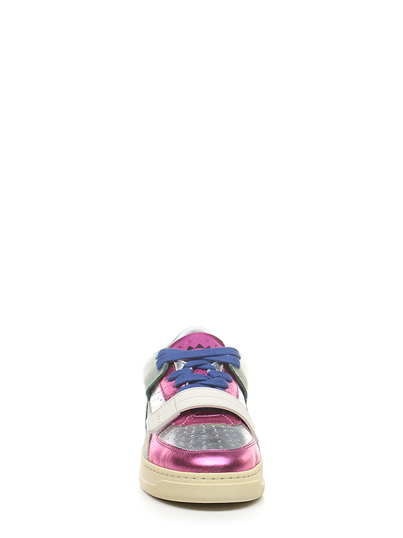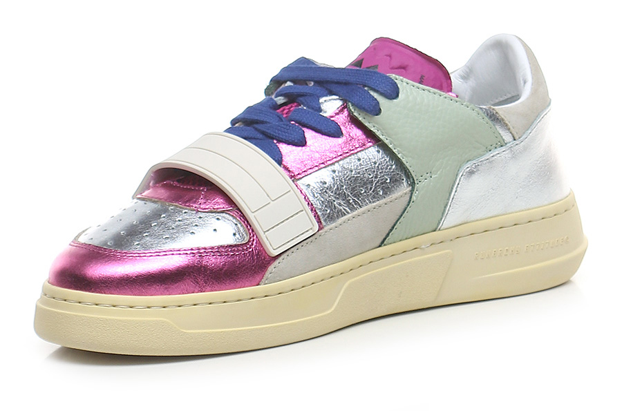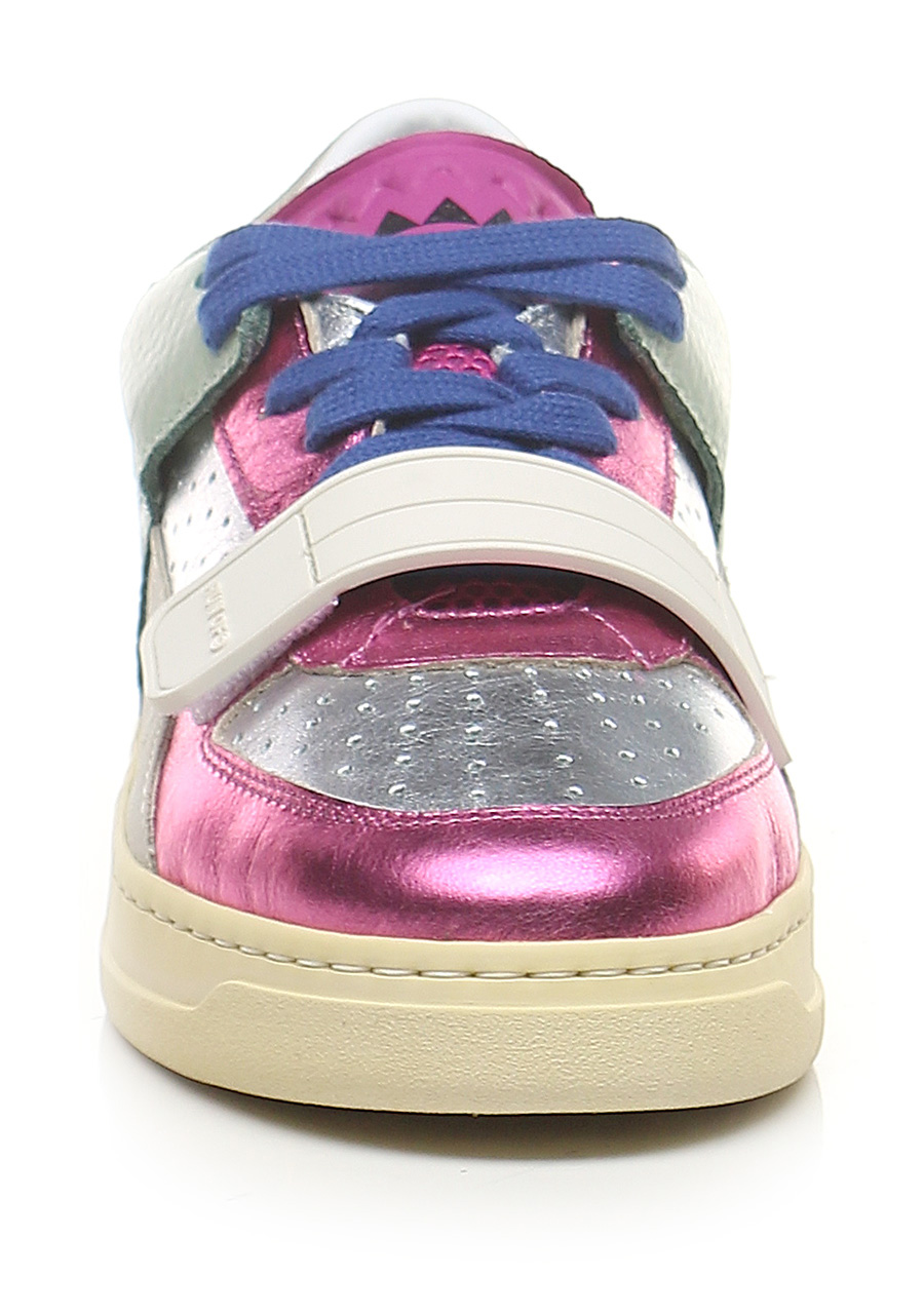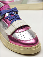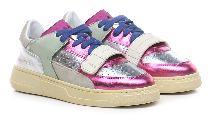 Sneaker in pelle laminata, camoscio e pelle con strap frontale. Suola in gomma. Altezza tacco 35mm, platform 25mm con battuta 10mm.