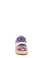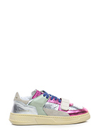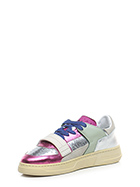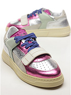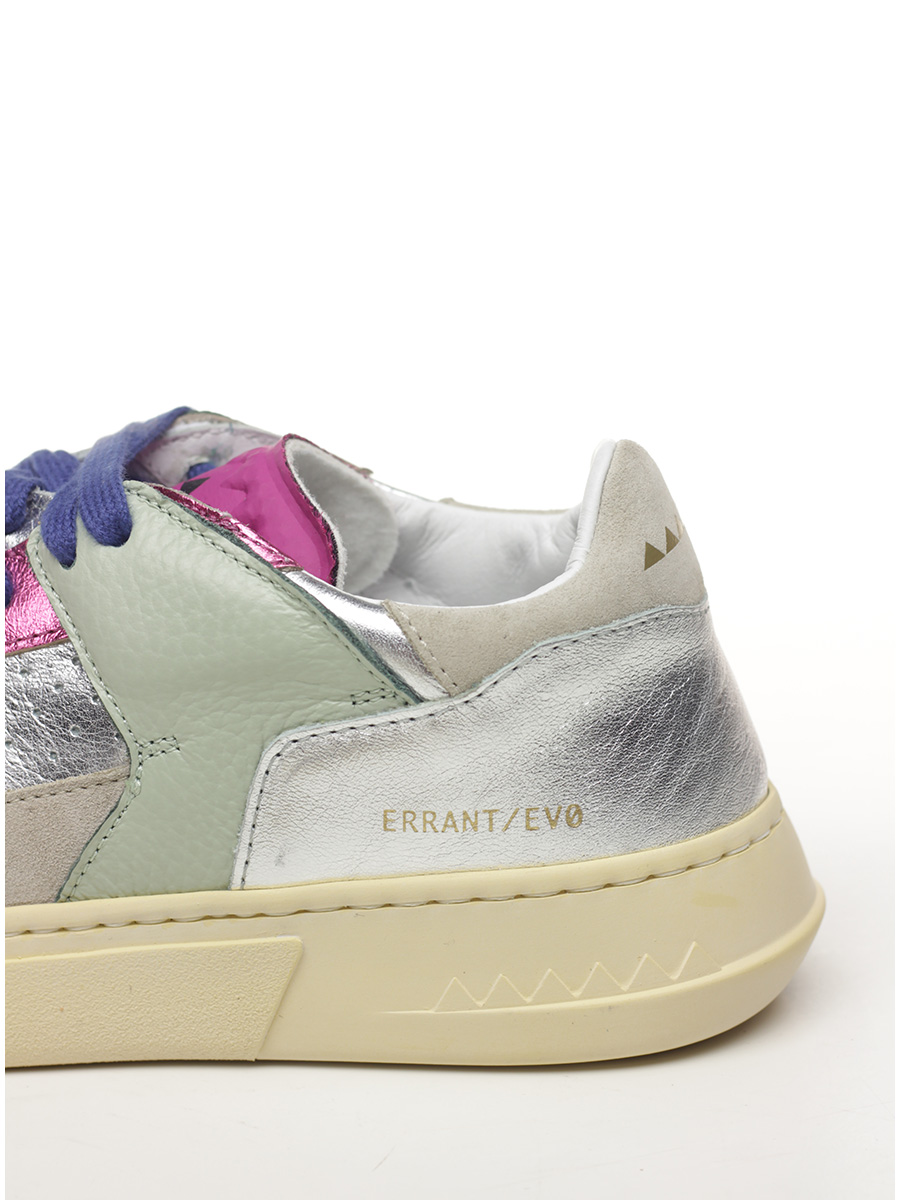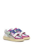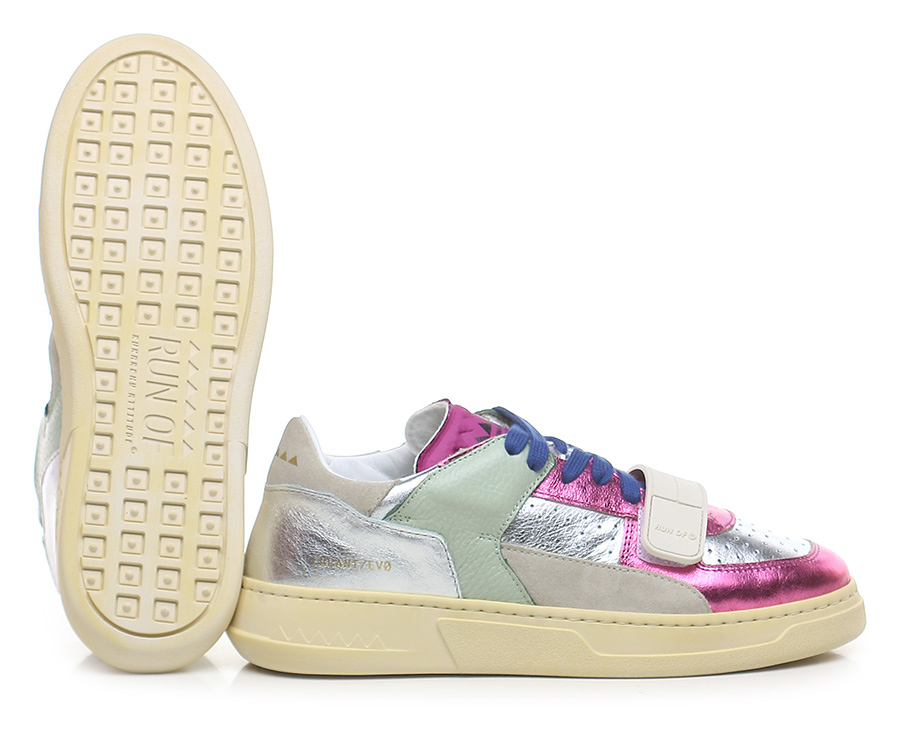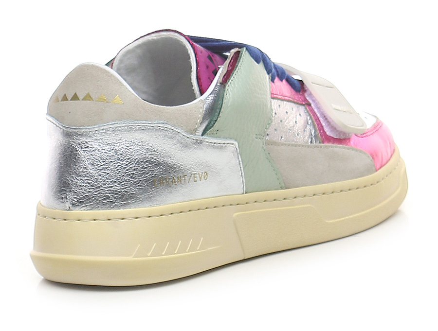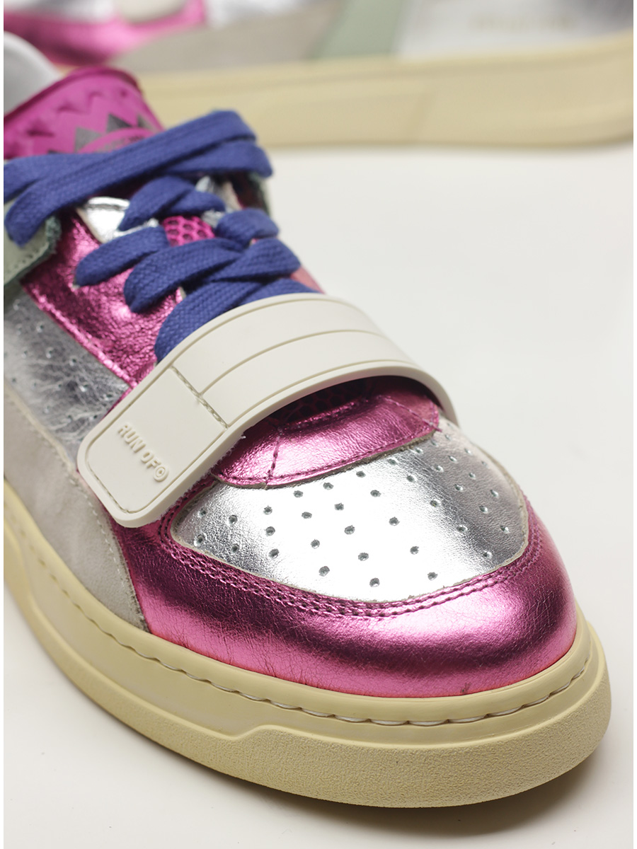 Sneaker in pelle laminata, camoscio e pelle con strap frontale. Suola in gomma. Altezza tacco 35mm, platform 25mm con battuta 10mm.