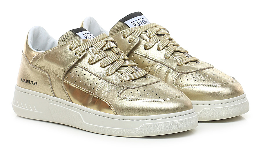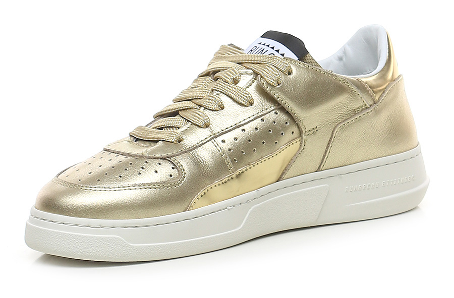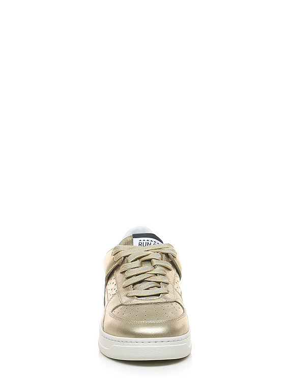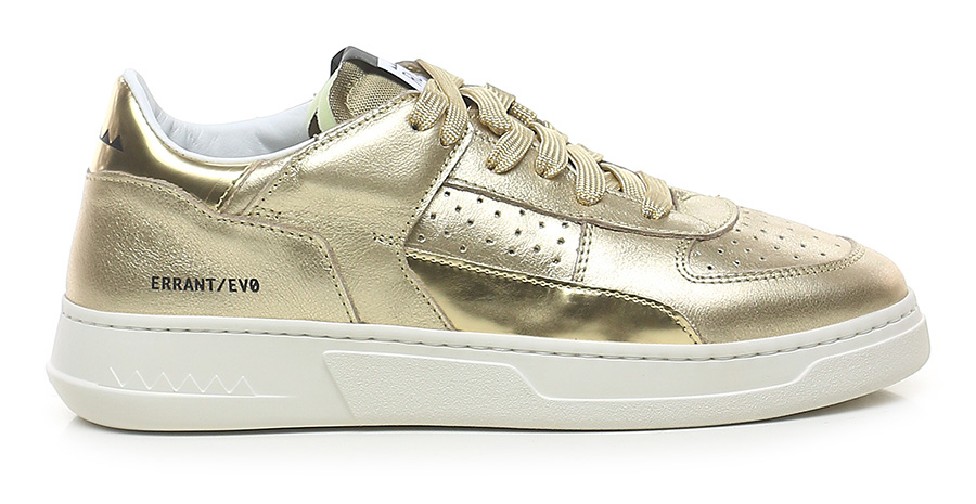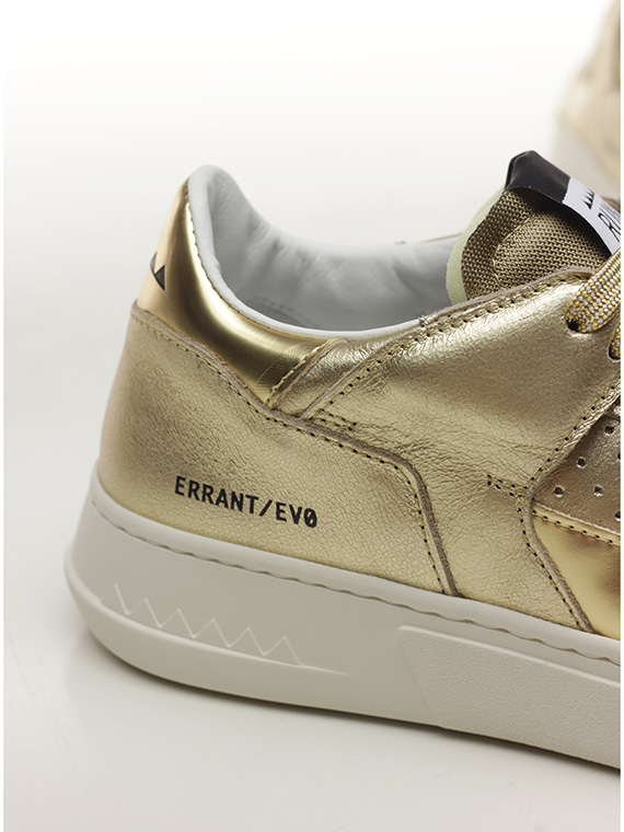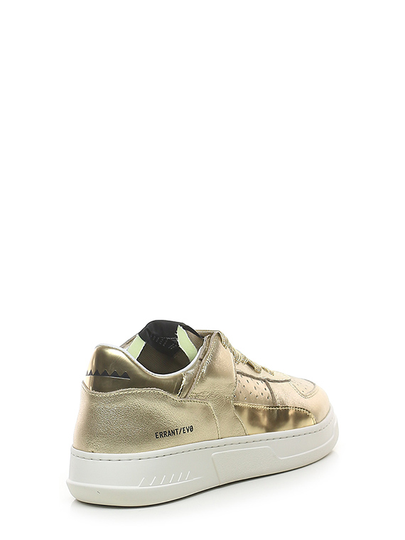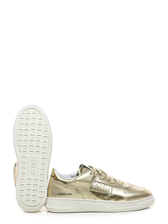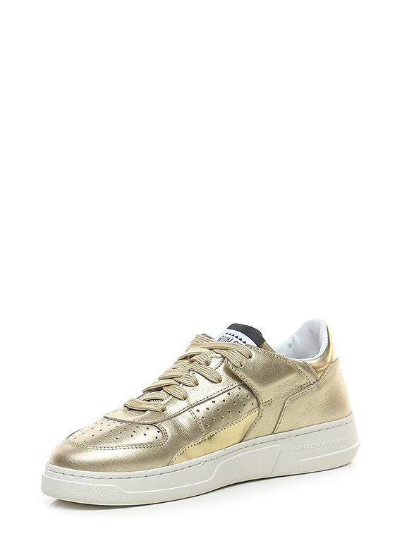 Sneaker in pelle laminata e pelle specchiata con suola in gomma. Altezza tacco 35mm, platform 25mm con battuta 10mm.