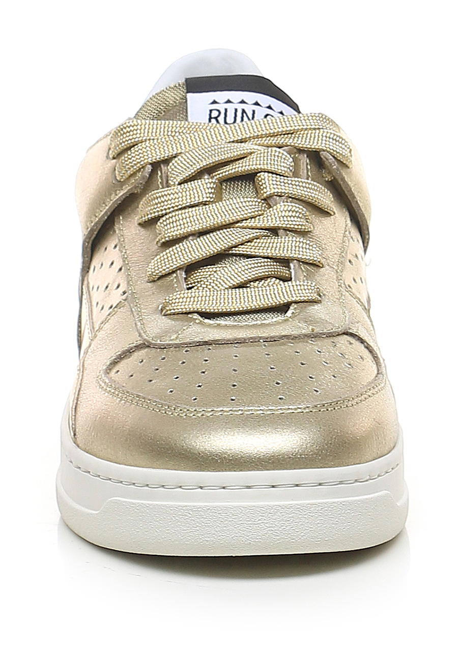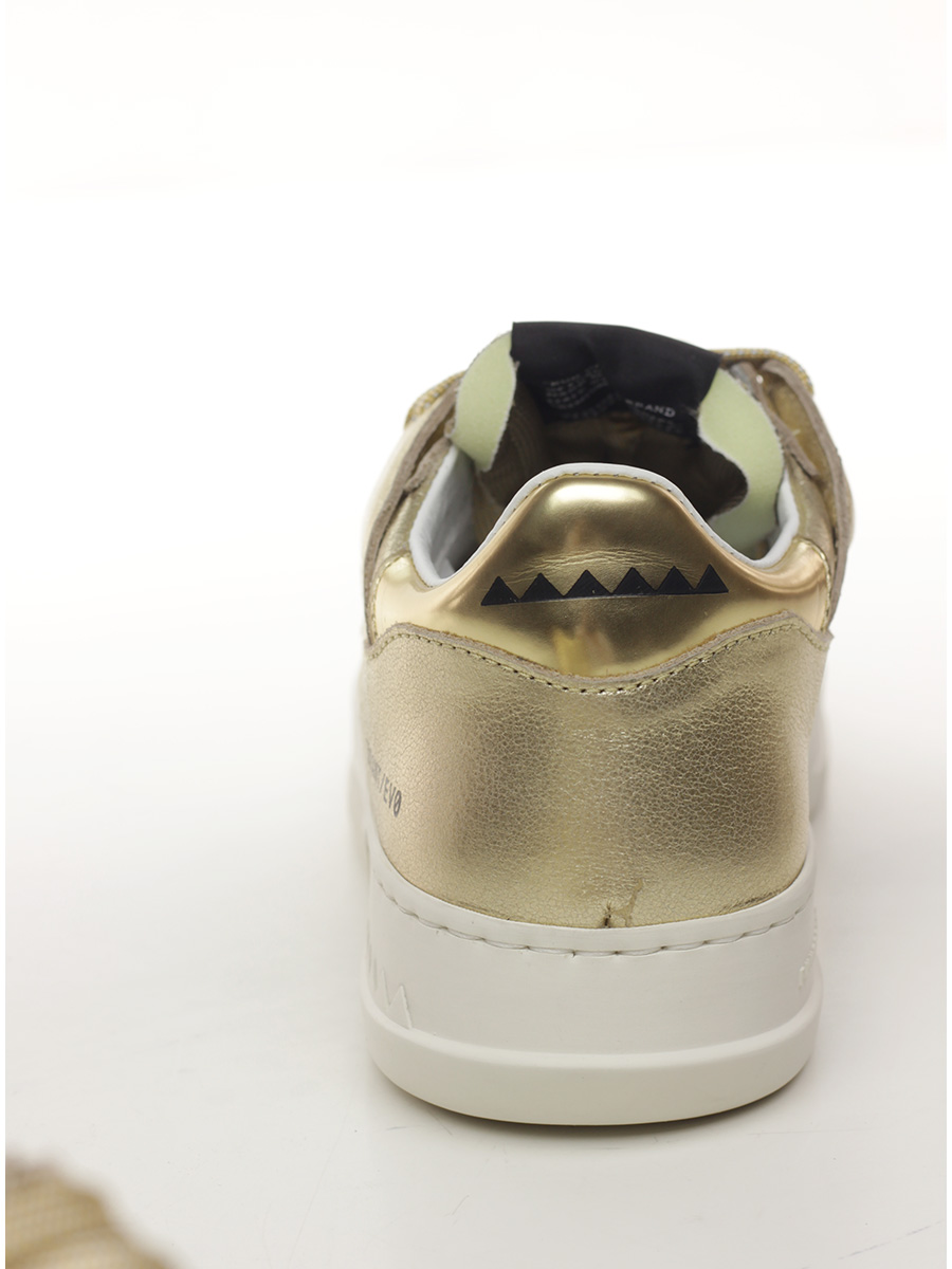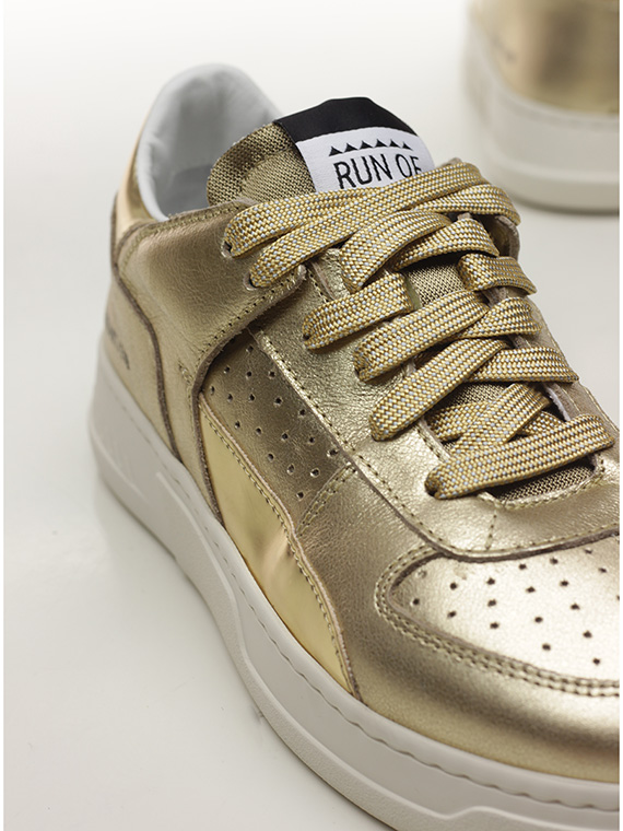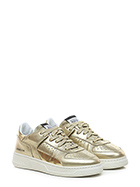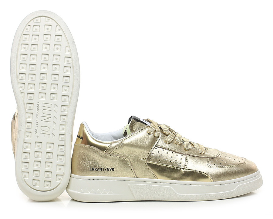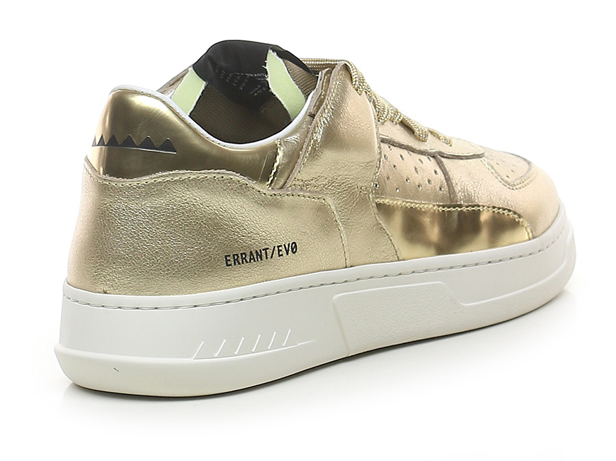 Sneaker in pelle laminata e pelle specchiata con suola in gomma. Altezza tacco 35mm, platform 25mm con battuta 10mm.
