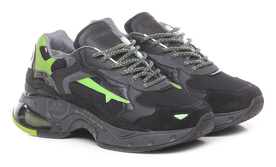 Sneaker in Pelle, camoscio e tessuto con multipatch su tomaia con camera d'aria, suola in gomma. Tacco 60, platform 30 con battuta 30, portachiavi incluso.