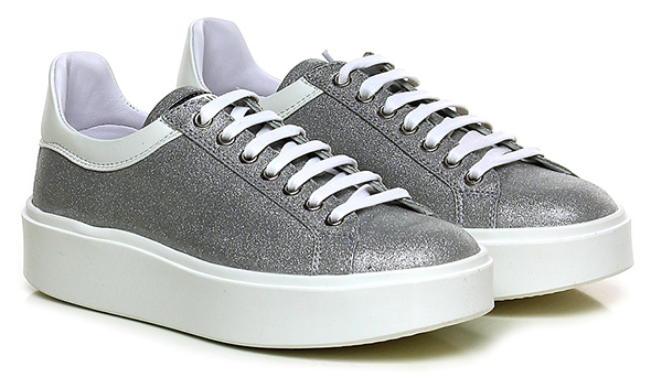 Sneaker in pelle e pelle effetto spruzzato glitter con strass su retro. Suola in gomma, tacco 35.