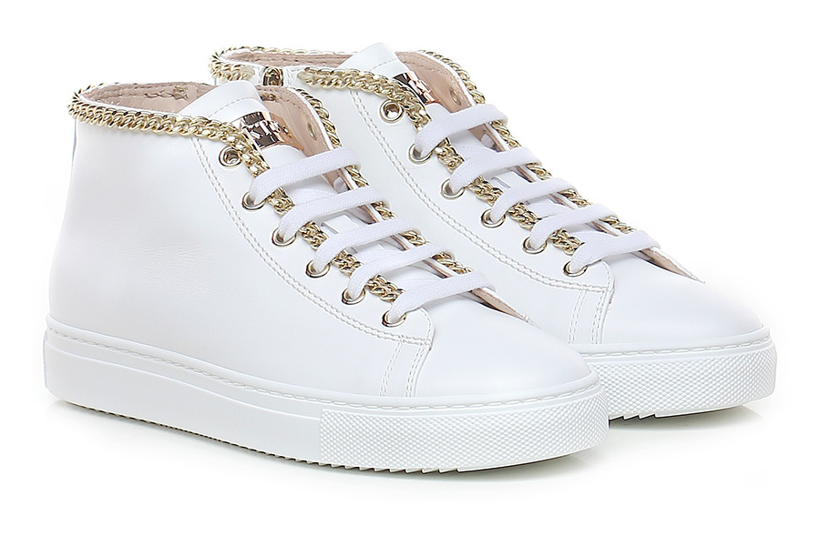 Sneaker in pelle con zip laterale e applicazione di catena gold su tomaia. Suola in gomma: altezza tacco 30mm, platform 25mm con battuta di 5mm.