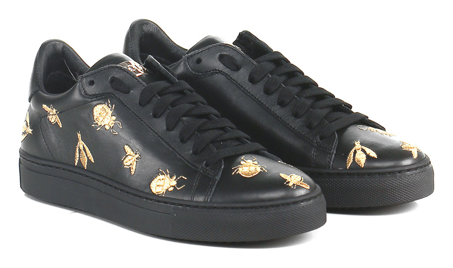 Sneaker in pelle con applicazioni ricamate su tomaia. Suola in gomma, tacco 30.