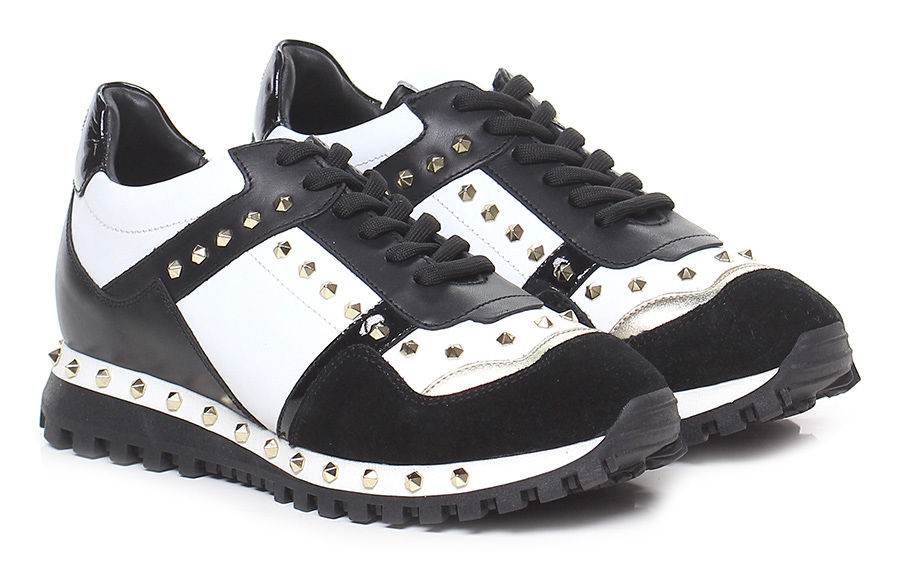 Sneaker in pelle, vernice, camoscio e pelle con applicazione borchie su tomaia. Suola in gomma, tacco 30, platform 20 con battuta 10. Zeppa interna 30.