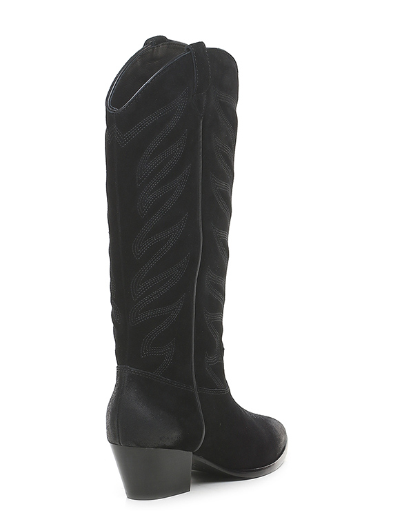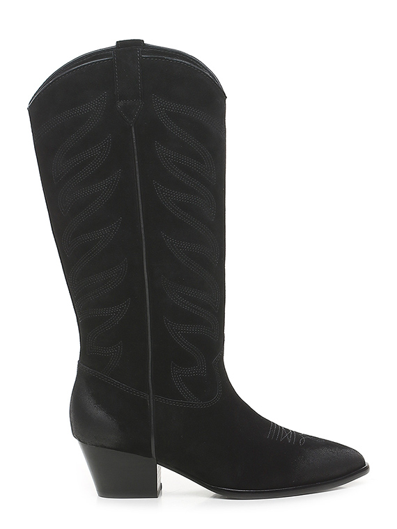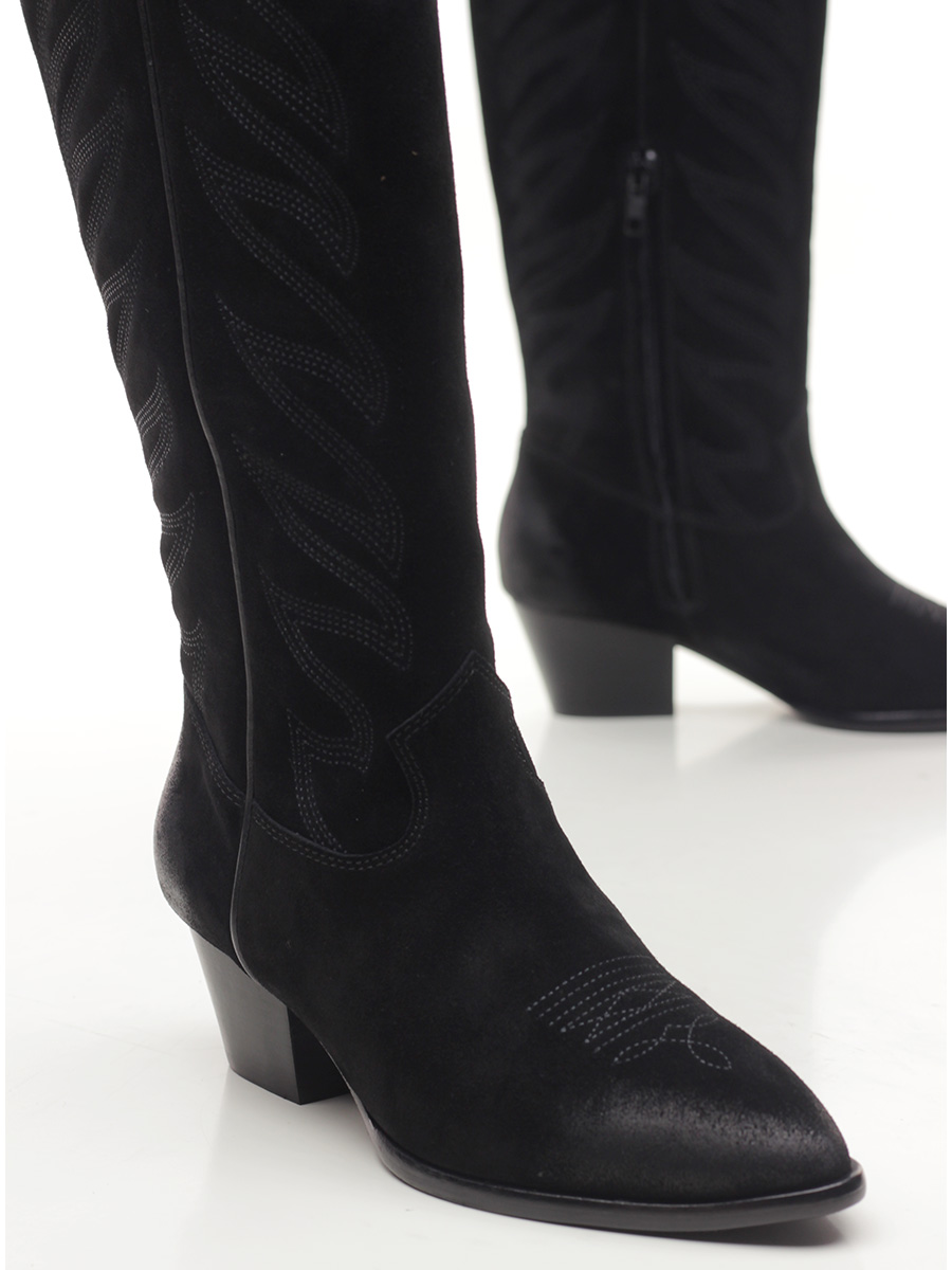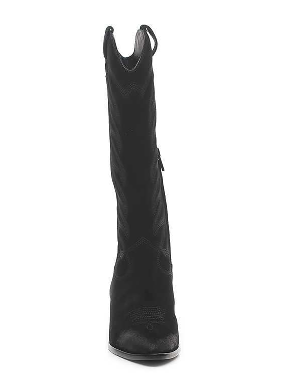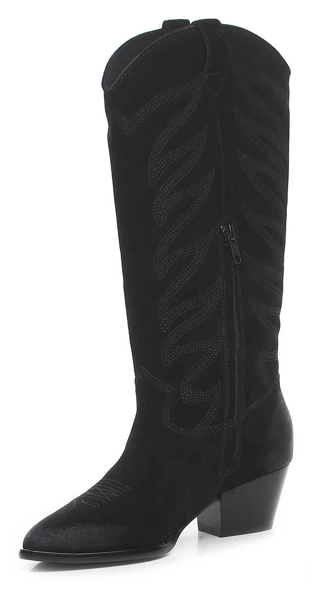 Stivale in camoscio effetto vintage con zip laterale e suola in cuoio e gomma. Altezza tacco 50mm. Taccco effetto legno. Altezza gambale 35cm.