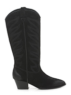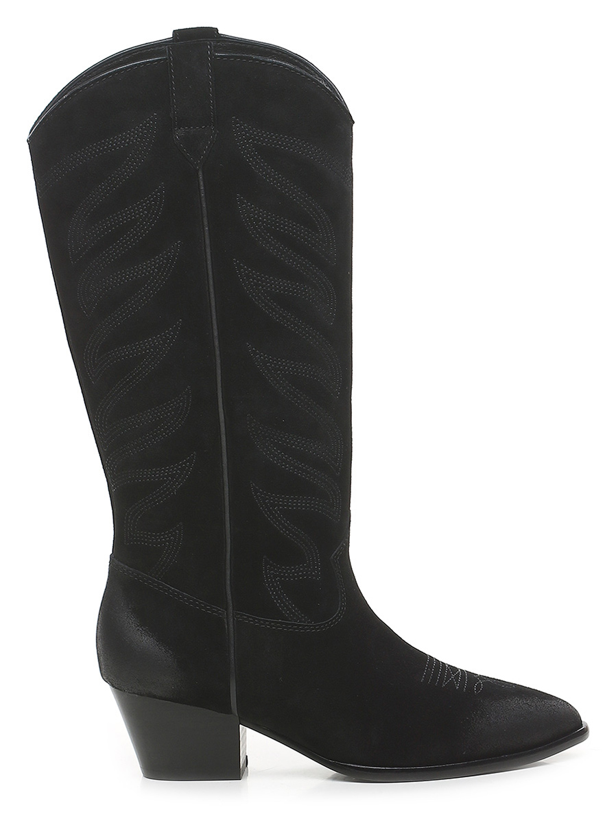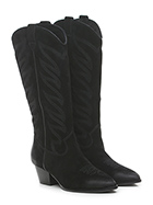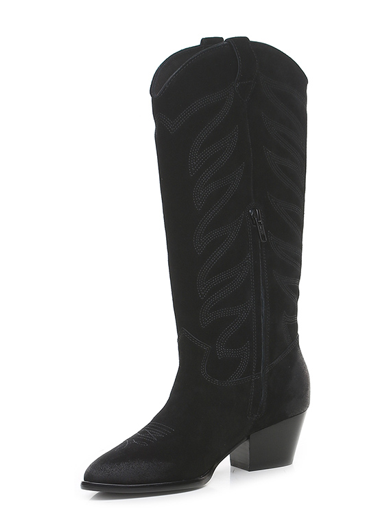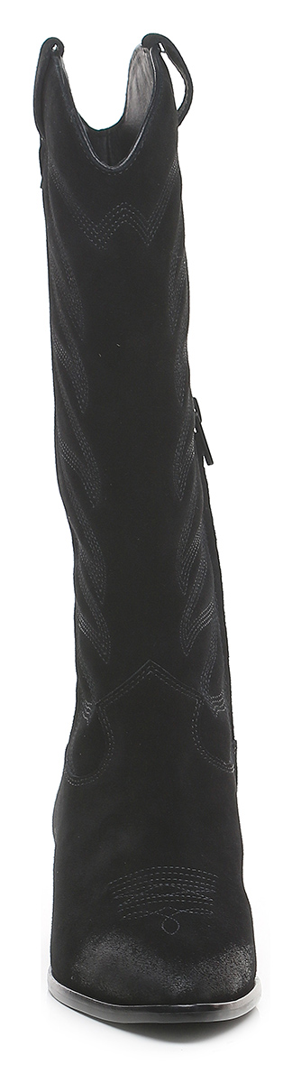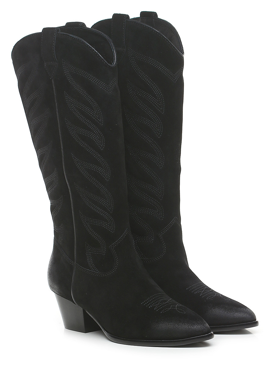 Stivale in camoscio effetto vintage con zip laterale e suola in cuoio e gomma. Altezza tacco 50mm. Taccco effetto legno. Altezza gambale 35cm.