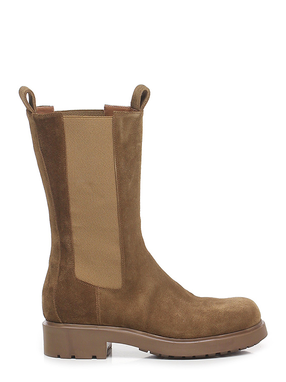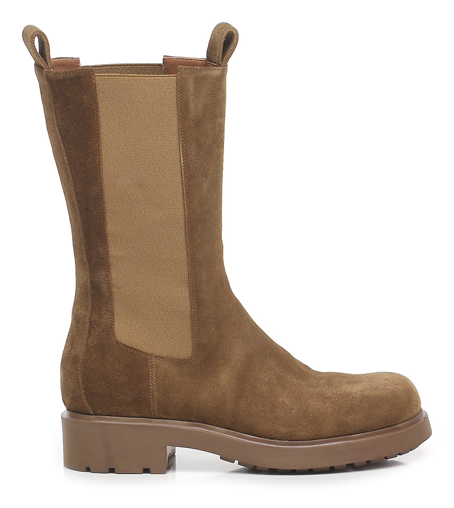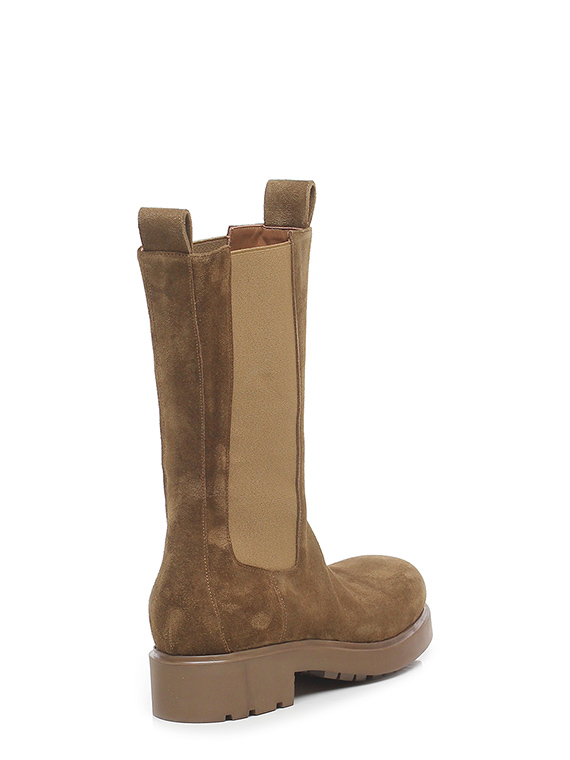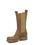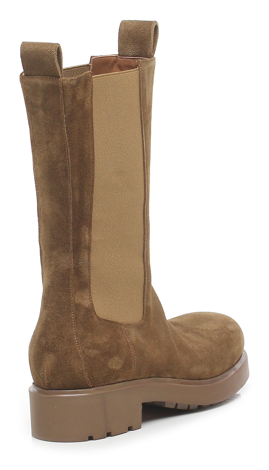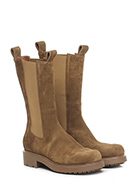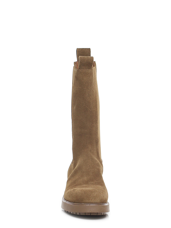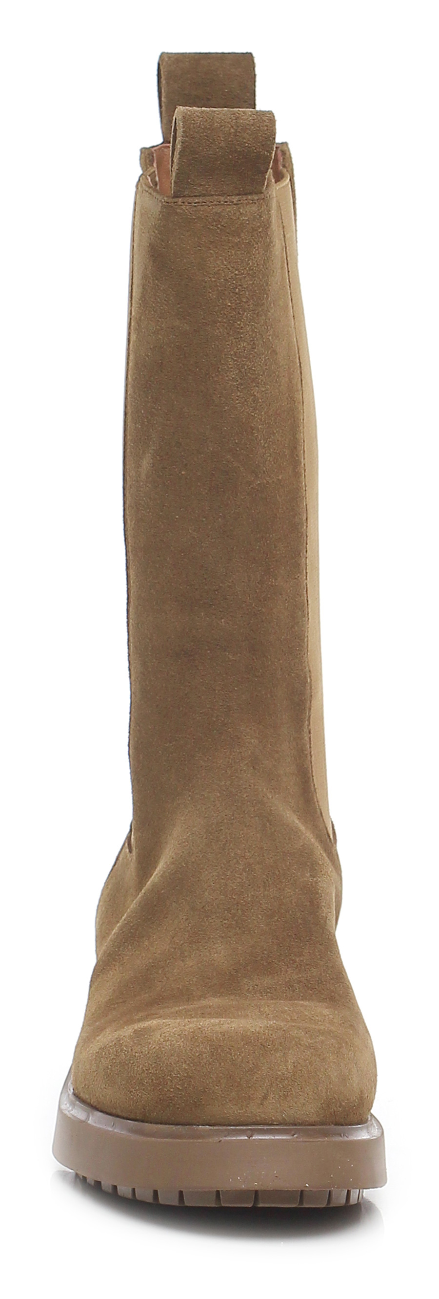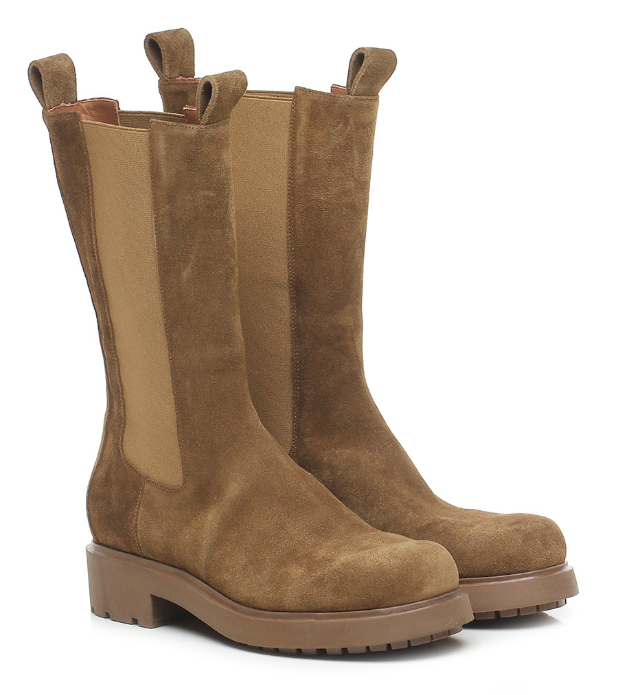 Stivale in camoscio effetto vintage con inserti elasticizzati ambo i lati, suola in gomma light. Tacco 45, platform 25 con battuta 20. Altezza gambale 250.