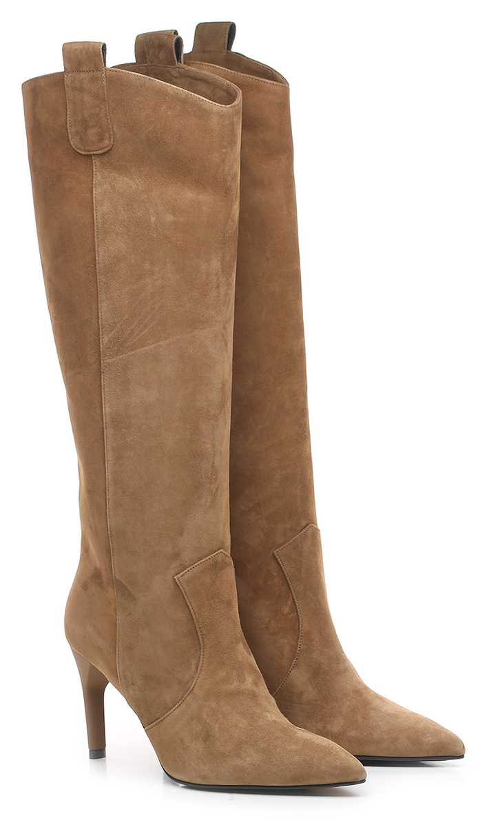 Stivale in camoscio con suola in cuoio. Altezza tacco 85mm. Tacco in pvc effetto opaco. Altezza gambale 35,5cm.