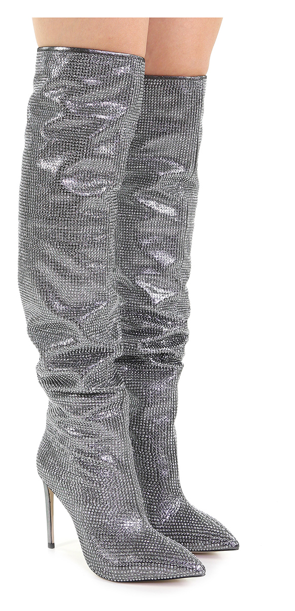 Stivale in pelle laminata con borchie su tomaia e suola in gomma. Tacco 105, altezza gambale 575.