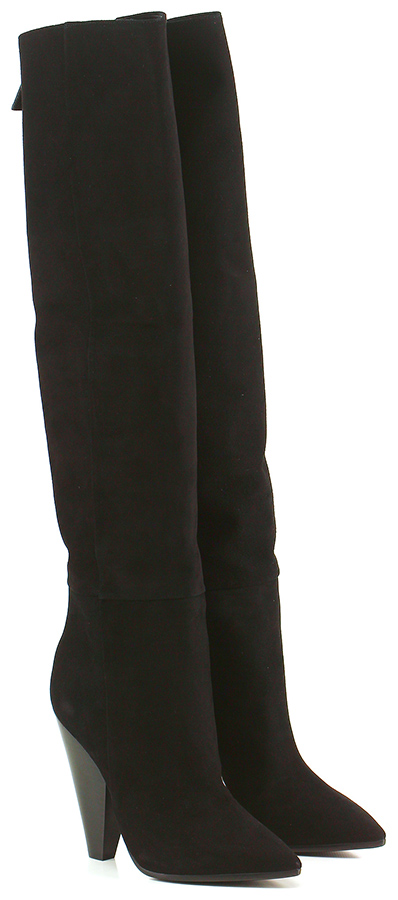 Stivale in camoscio con zip su retro e suola in cuoio, tacco 120, platform 15 con battuta 105. Altezza gambale 495.