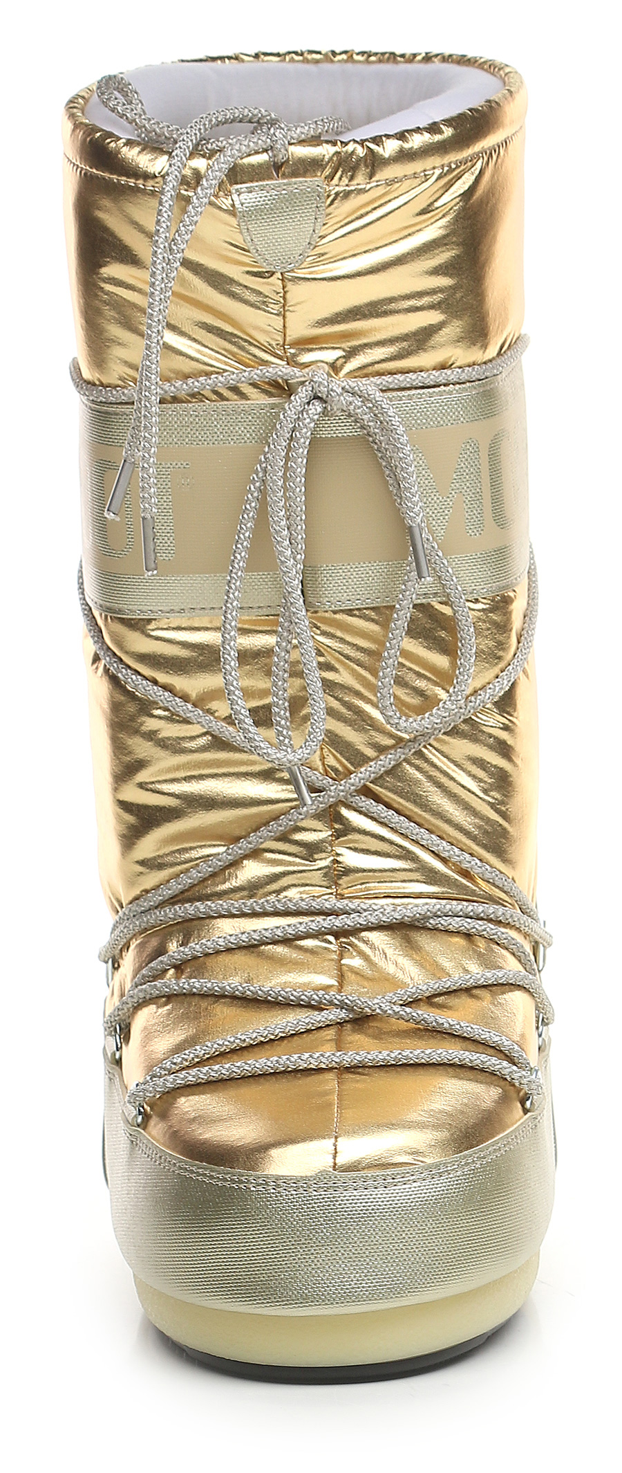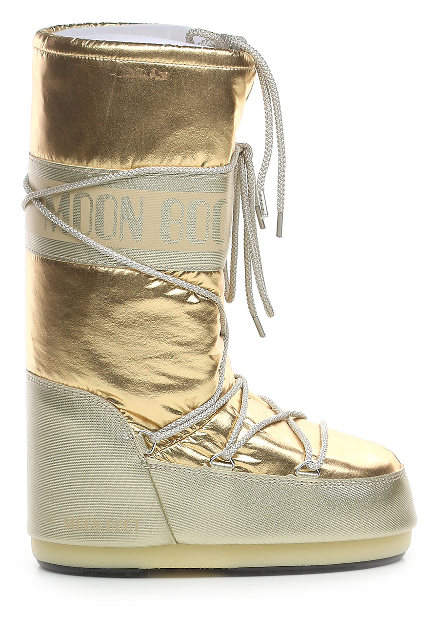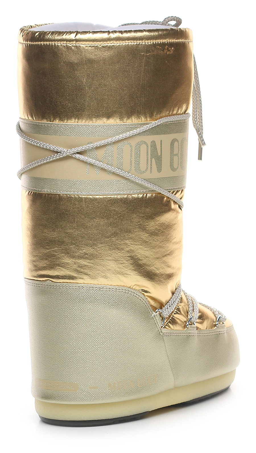 Stivale in similpelle effetto laminato e tessuto laminato con suola in gomma. Altezza suola 20mm. Zeppa interna 30mm. Altezza gambale 32cm.
