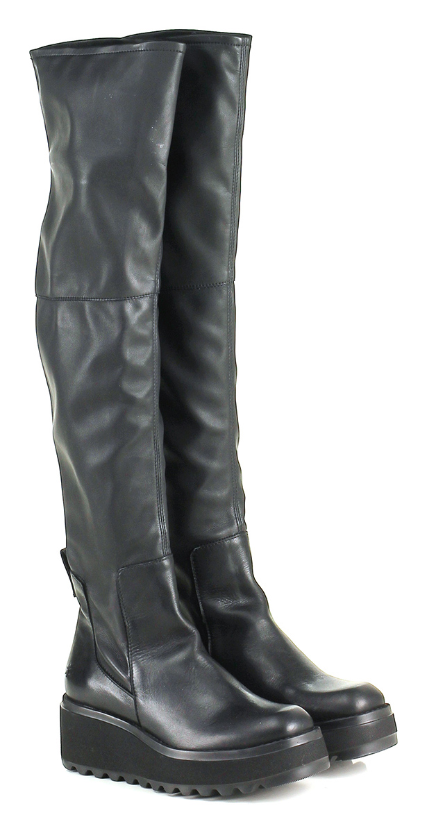 Stivale in pelle ed eco pelle stretch con gambale elasticizzato e suola in gomma. Tacco 60, platform 35, platform 25. Altezza gambale 550.