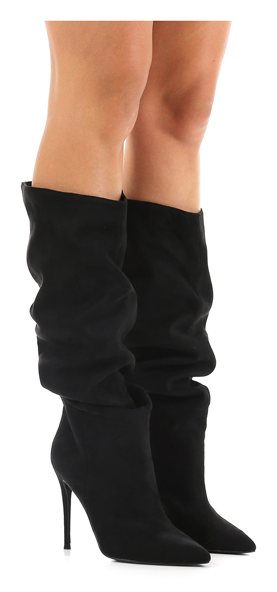 Stivale in eco pelle scamosciata con gambale elasticizzato, suola in gomma. Tacco 110. Altezza gambale 445.