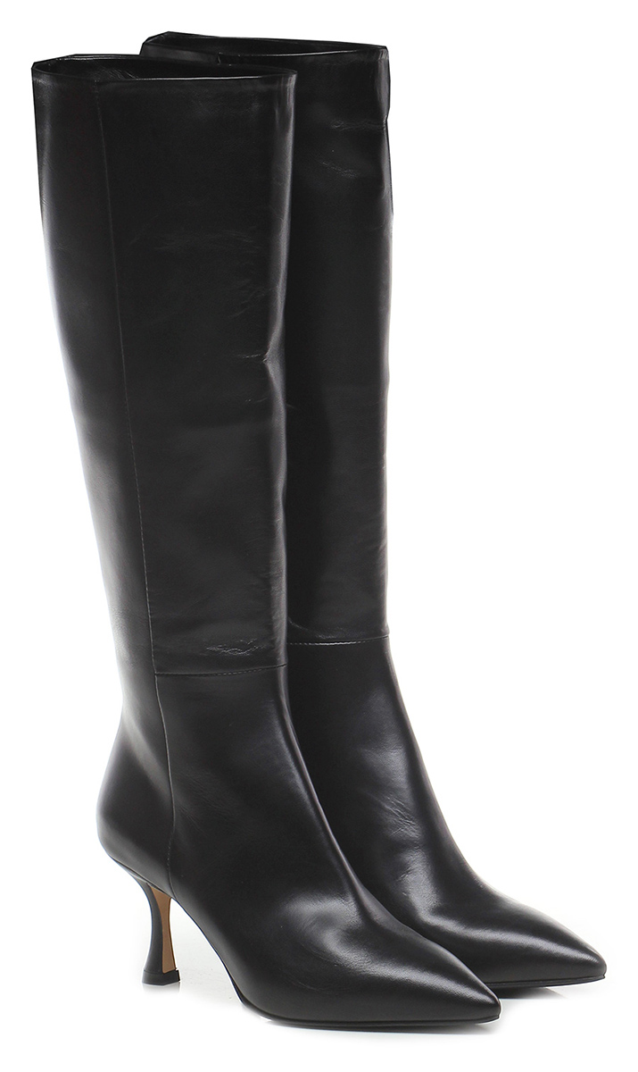 Stivale in nappa con zip lato interno, suola in cuoio e gomma. Tacco 75, svasato. Altezza gambale 400.