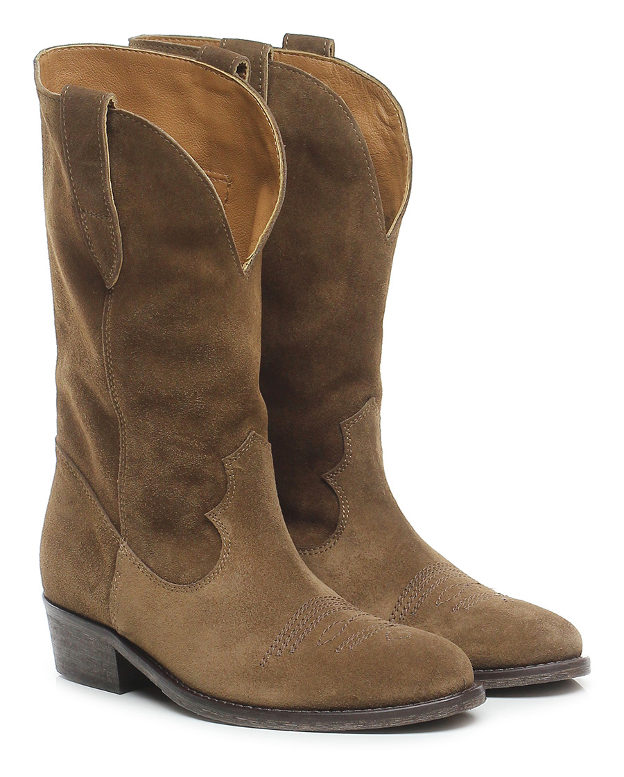 Stivale in camoscio con tomaia ricamata, suola in cuoio. Tacco 40, altezza gambale 265.