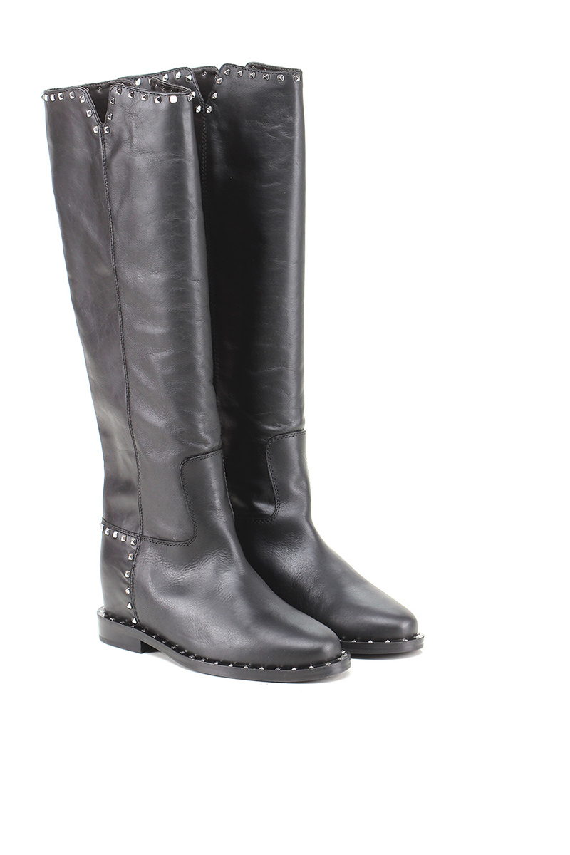 Stivale in pelle effetto vintage con suola in cuoio e gomma. Tacco 30, zeppa interna 35, altezza gambale 430.