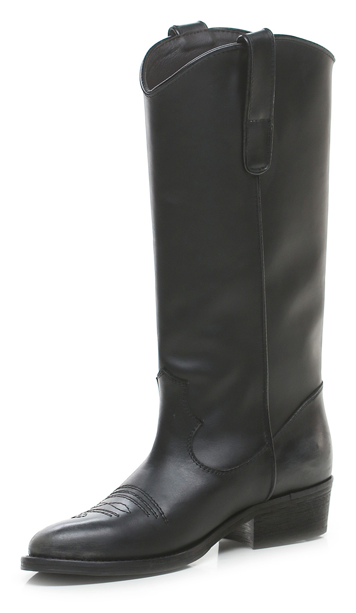 Stivale in pelle effetto vintage con ricamo frontale. Suola in cuoio e gomma. Tacco 40mm. Altezza gambale 29 cm.