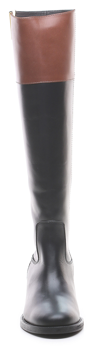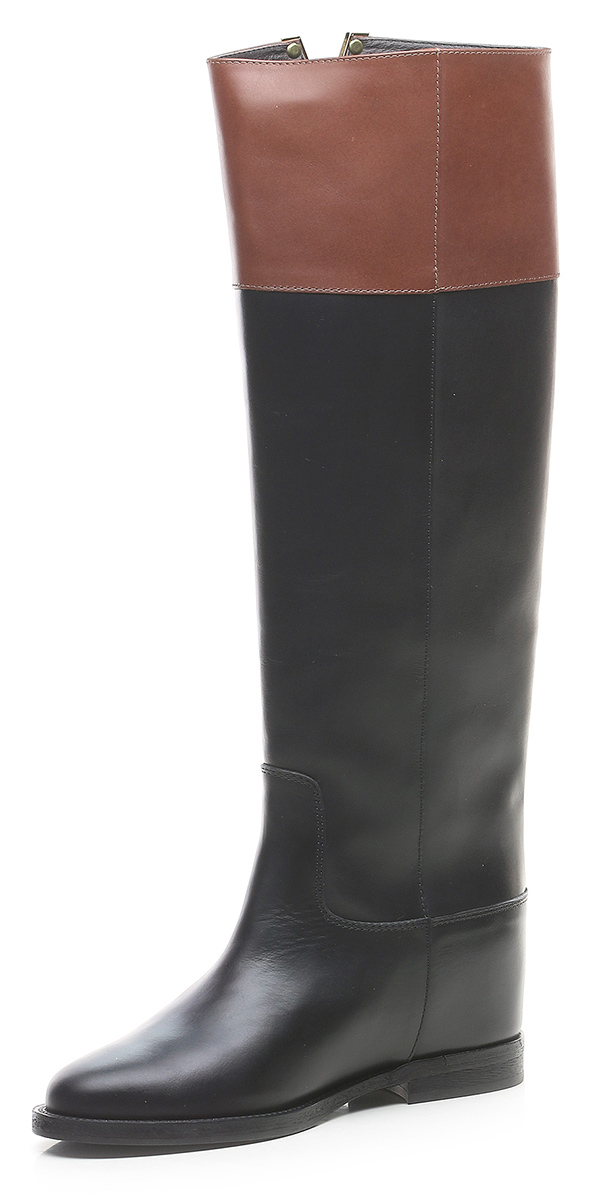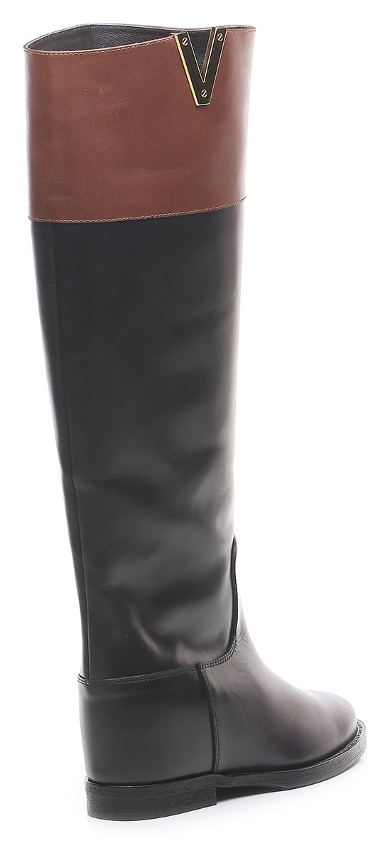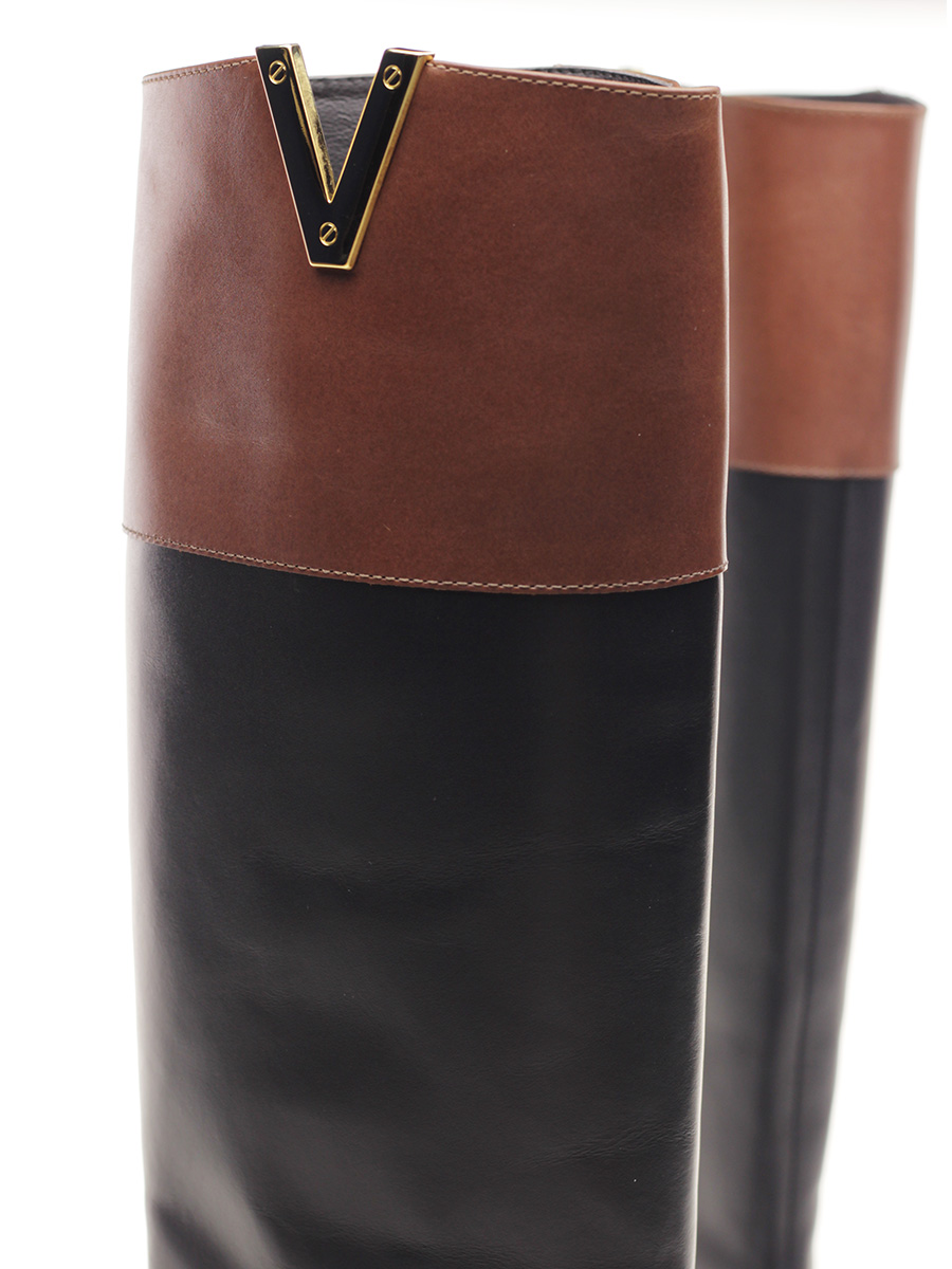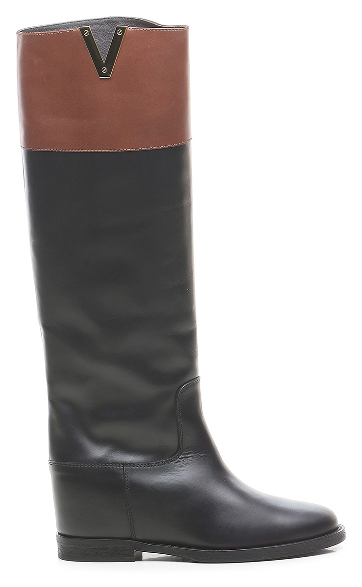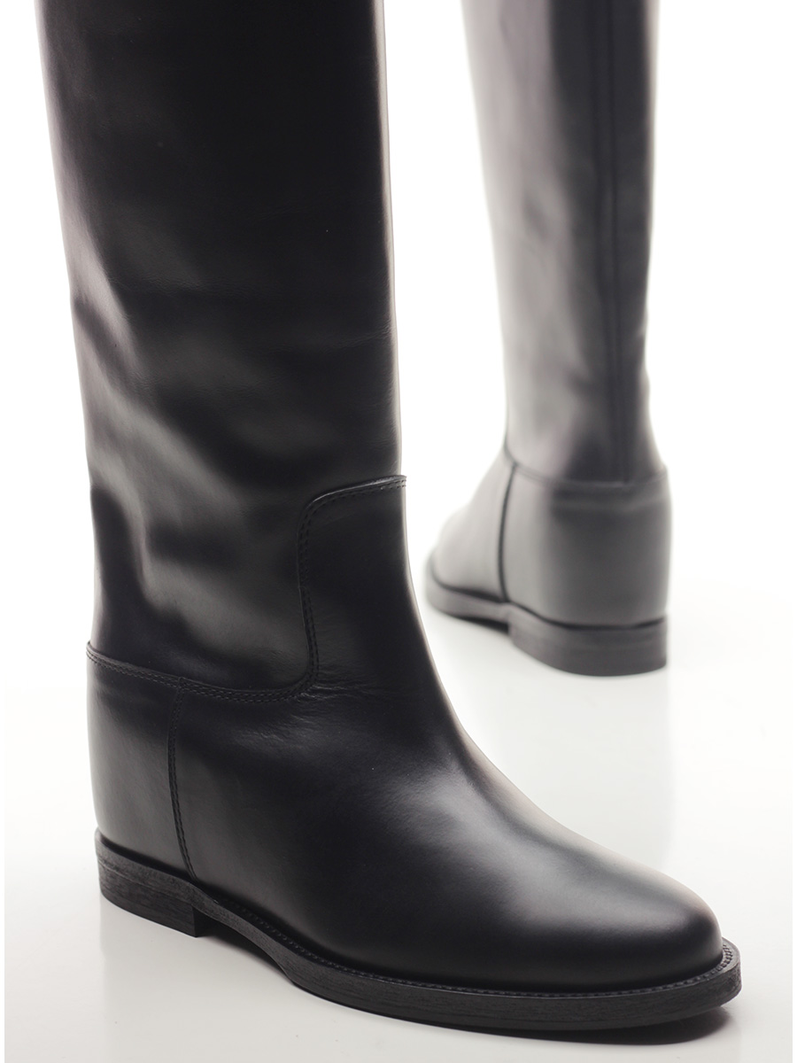 Stivale in pelle con accessorio metallico golg laterale. Suola in cuoio e gomma. Altezza tacco 20mm. Zeppa interna di 40mm. Altezza gambale 42,5cm.